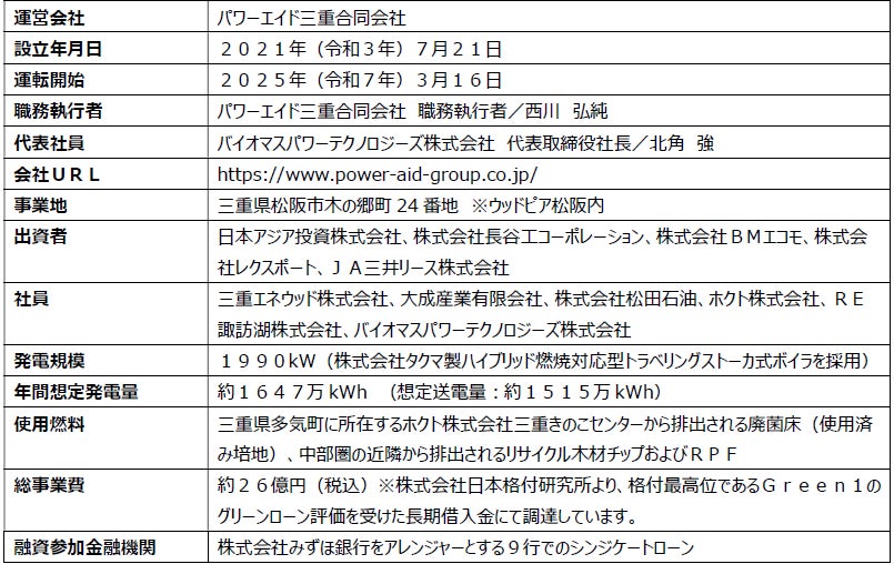 本事業は、バイオマスパワーテクノロジーズ株式会社(本社:三重県松阪市)が、2021年7月に設立したパワーエイド三重合同会社(本社:同県同市)が建設・運営する、完全NON-FIT型で組成する木材・製造業生産副産物ハイブリッド燃料による脱炭素電源を開発する事業です。