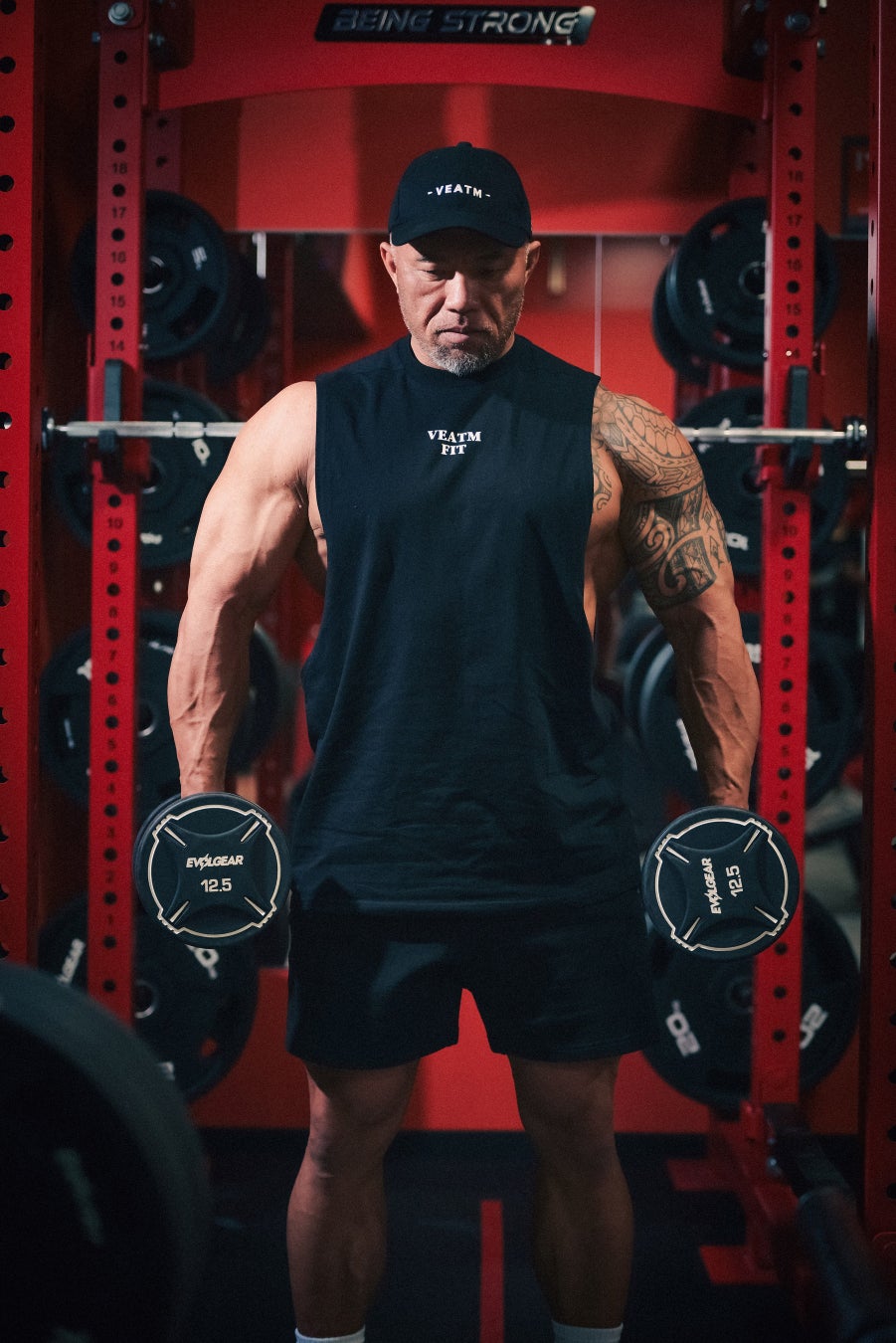 通常のNO SLEEVE TOPSとは異なり、腕や肩まわりのトレーニングの際、筋肉の動きがわかりやすく、ラウンドネックはフィット感を重視し、不要な露出を抑えたカッティング。脇下は広く取ることで広背筋の動きを妨げず、背中のトレーニングにもフォーカスしやすい。身体の動きに基づき、機能性を重視したワークアウト用のノースリーブ。生地は着心地とストレッチ性(伸縮性)にこだわったコットンとポリウレタンの素材を使用。背面はダンベルをモチーフにしたグラフィックが特徴的、正面はシンプルにVEATMロゴをラバープリントで表現。