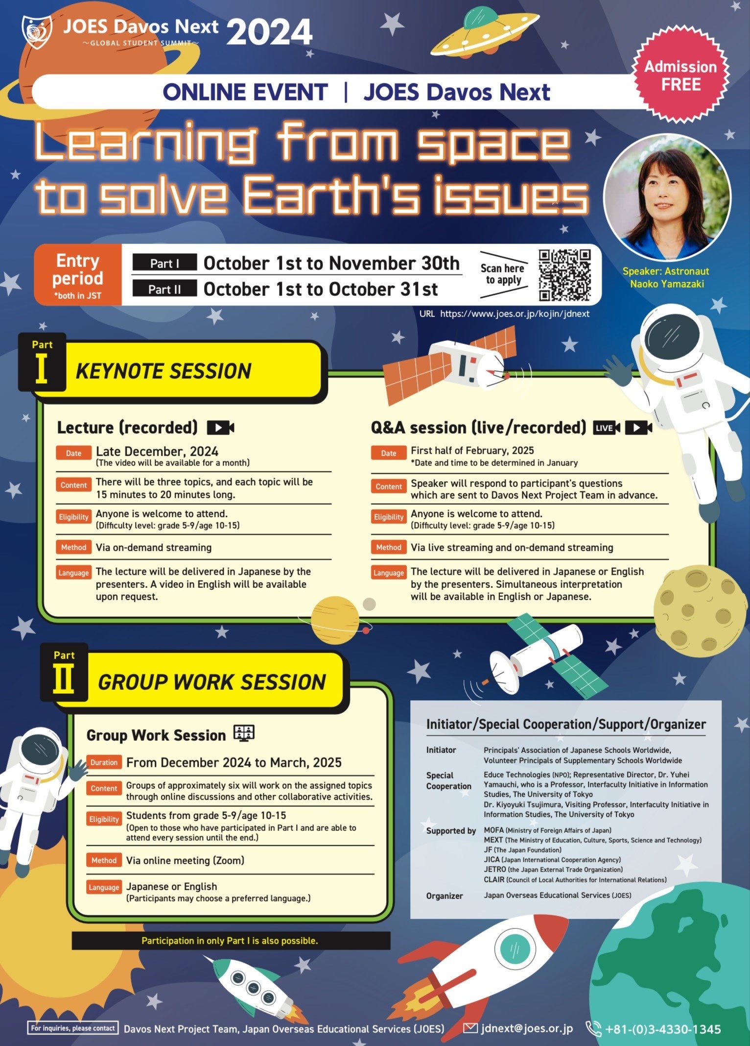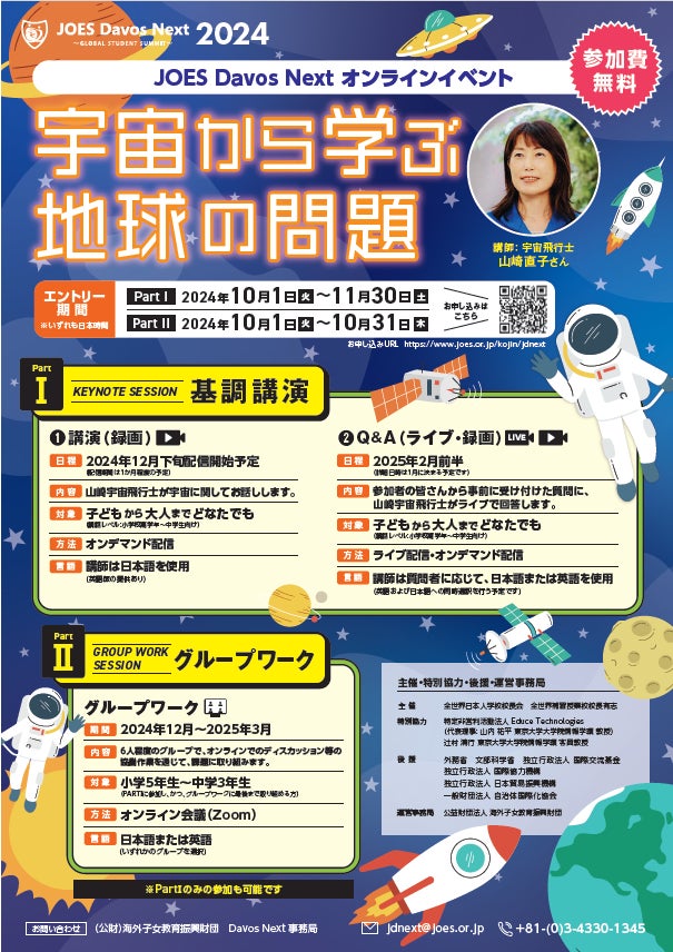 公益財団法人 海外子女教育振興財団は、宇宙飛行士の山崎直子さんを講師にお迎えし、JOES Davos Next 2024~GLOBAL STUDENT SUMMIT~「宇宙から学ぶ地球の問題」と題したイベントを12月より開催いたします。それに先立ち、10月1日より参加者のエントリーを開始いたしました。