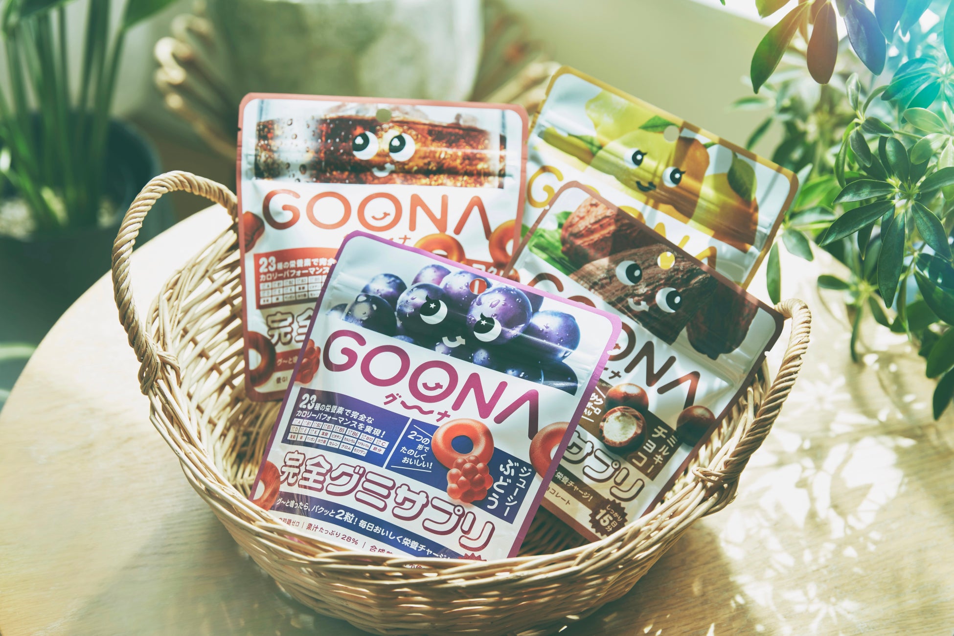 GOONA(グーナ)は、毎日の生活に無理なく取り入れられるグミタイプ・チョコタイプの新感覚サプリメントブランドです。1日わずか2粒で、日本人に不足しがちな23種類の必須栄養素を効率的に補えるよう、『完全カロリーパフォーマンス設計』で開発されています。