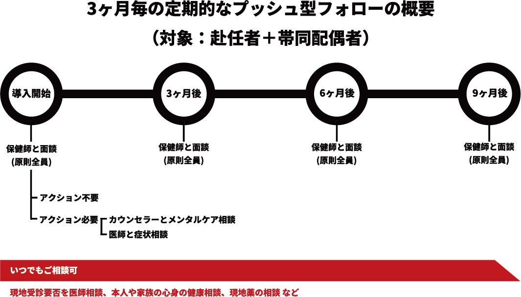 ①海外での心身の健康管理に詳しい保健師による定期面談