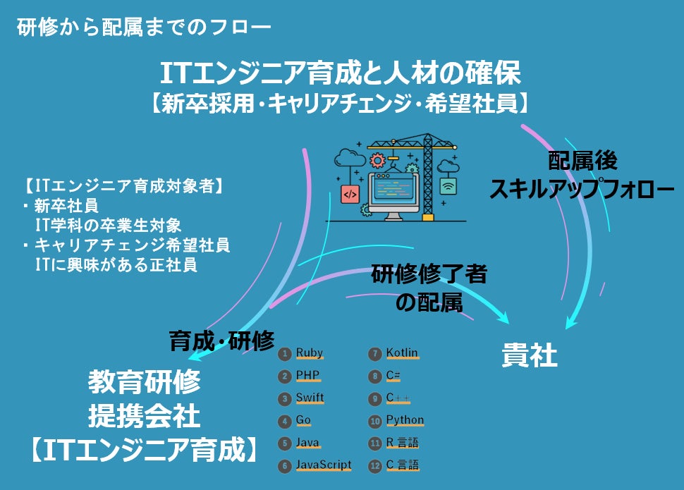 そこで東洋ワークでは、ITエンジニアの教育・育成事業を開始。お客様の人材不足の解消を目的とし、技術革新やビジネスモデルの変化に対応するため、業務上で必要とされる新しい知識やスキルを学べる環境を構築しました。