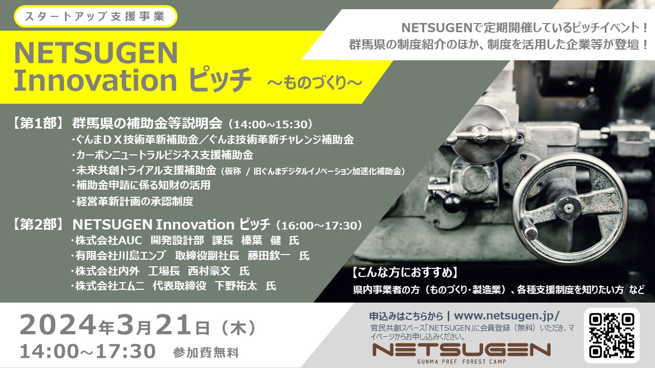 今回のテーマは「ものづくり」です。第1部に県が令和6年度に実施予定の制度を紹介する「補助金等説明会」、第2部に「NETSUGEN Innovationピッチ」を開催いたします。