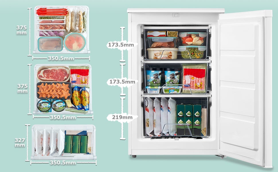冷蔵庫のように前開き式で庫内が見やすい透明な引き出しなので、取り出しも整理整頓も簡単です。引き出しが3個ついていますので、各段ごとに異なっている食材を収納できます。さらに、引き出しのデザインなので、冷気が逃げにくくて、食品を素早く冷凍することができます。