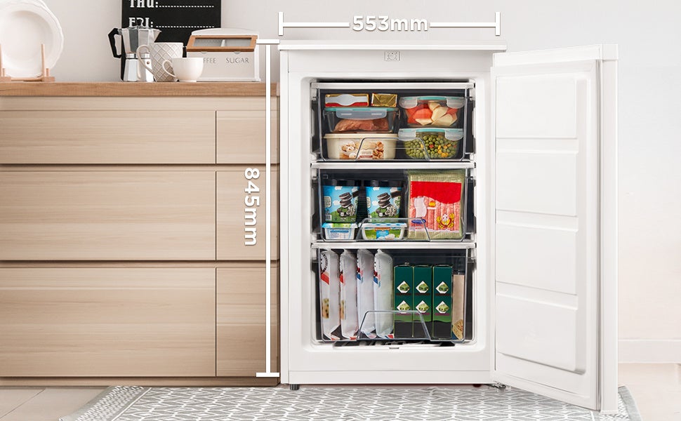 コンパクトでシンプルなデザインは、スペースを取らずにどこにでも設置可能です。86L大容量冷凍庫は、今の冷蔵庫にプラスし、2台目の専用冷凍庫におすすめです。おまとめ買いした冷凍食品やアイスクリームも余裕で収納できます。透明な引き出しが付いているため、中身が見やすい前開き式タイプは日常の食生活に大活躍します。