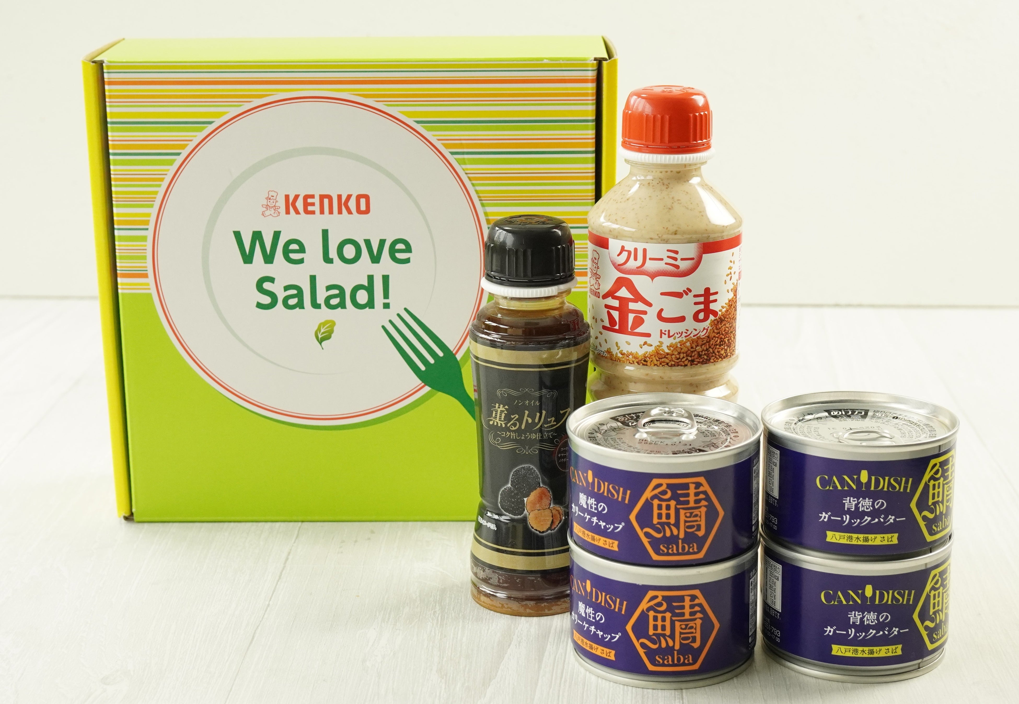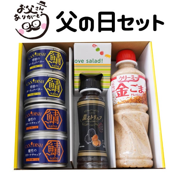 当社からお届けするギフトセットは、当社お父さん社員がおすすめする鯖の缶詰&ドレッシング類です。缶をあけるだけでまるで外食気分を味わえる『CANDISH🄬 saba』シリーズ各2缶に加え、しょうゆベースで和洋問わずさまざまな料理に合う調味料『ノンオイル薫るトリュフ ~コク旨しょうゆ仕立て~』1本、金ごまの上品な風味を引き出したクリーミーなテイストの『クリーミー金ごまドレッシング』1本の6点セットです。