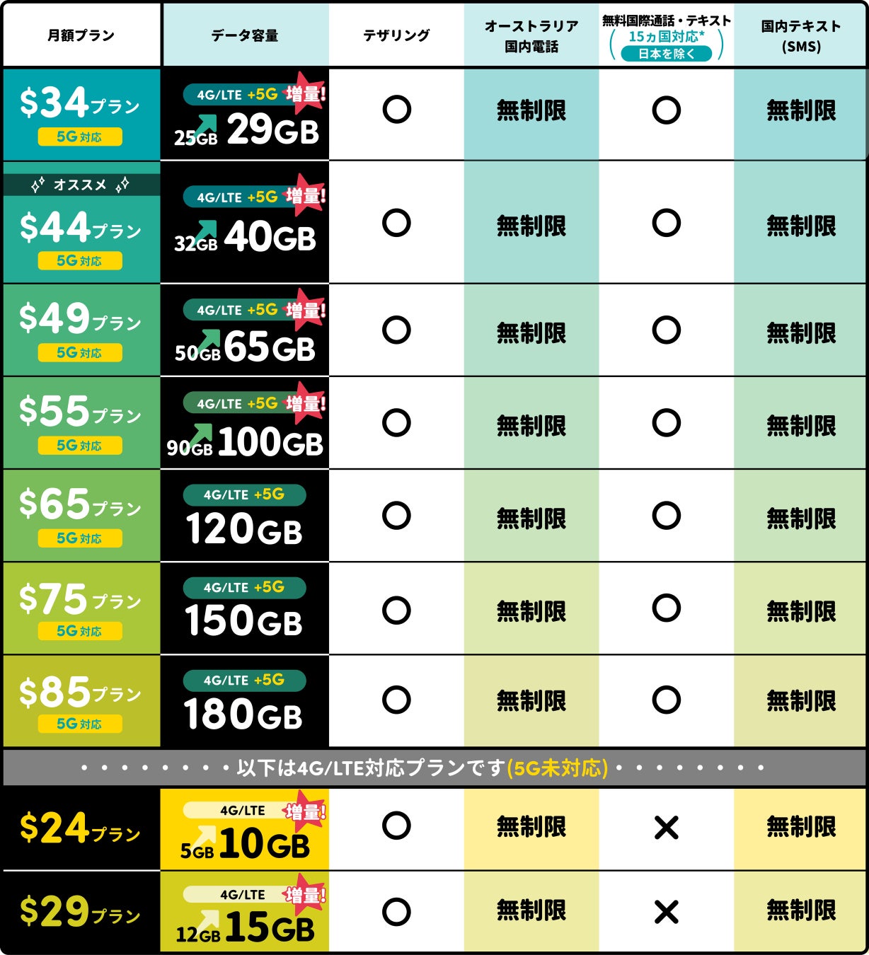 5G対応プラン($34〜$85プラン)