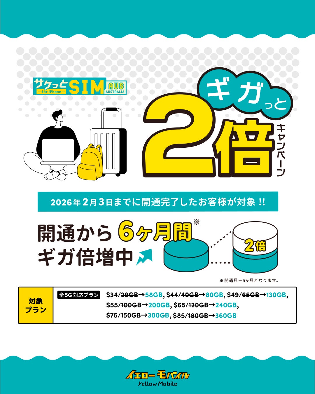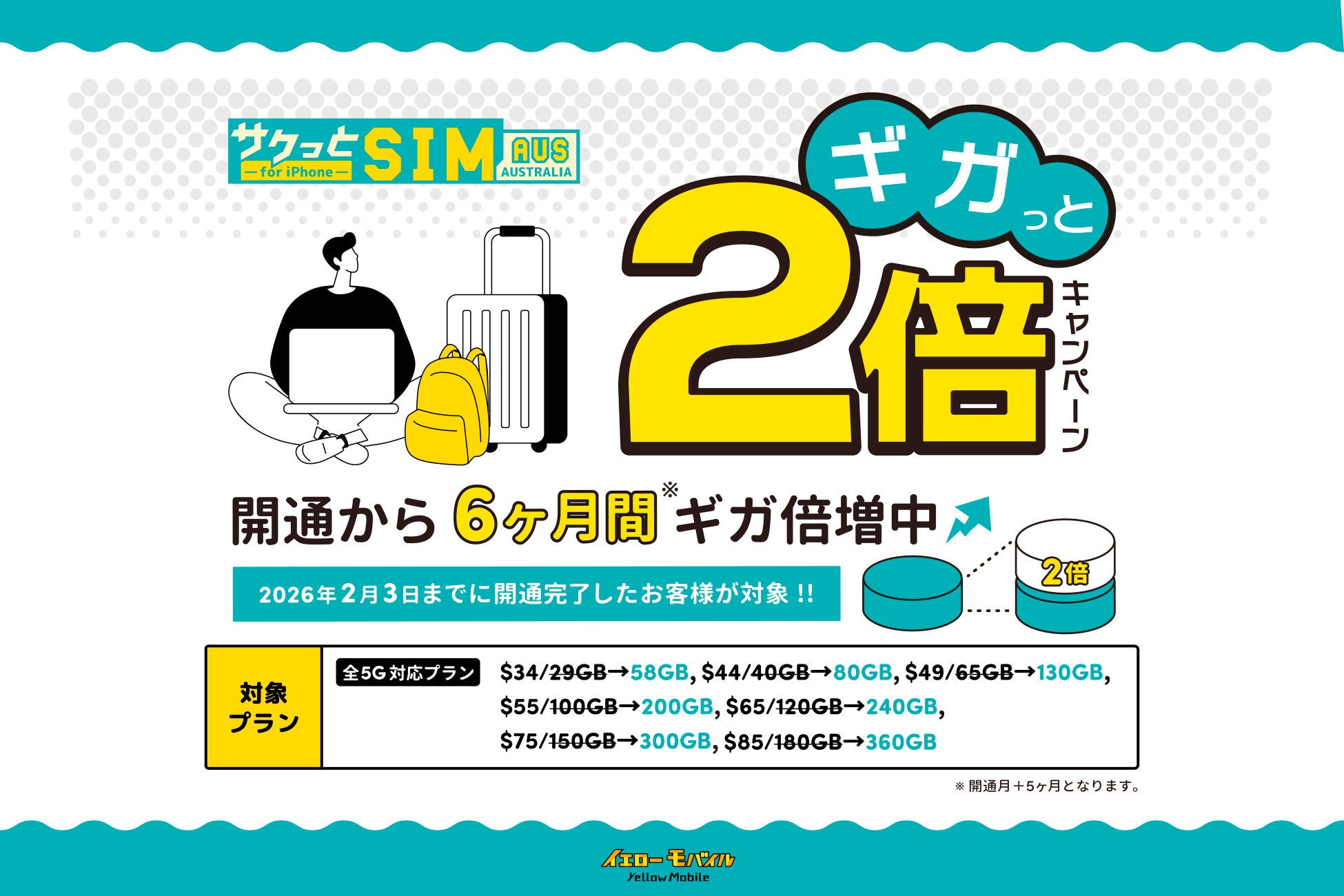 イエローモバイルは今回、オーストラリア向けSIMカード『サクっとSIM 【AUS】 for iPhone』の対象プランを価格そのままでデータ増量に伴い、さらに『ギガっと2倍キャンペーン』を開始しました。