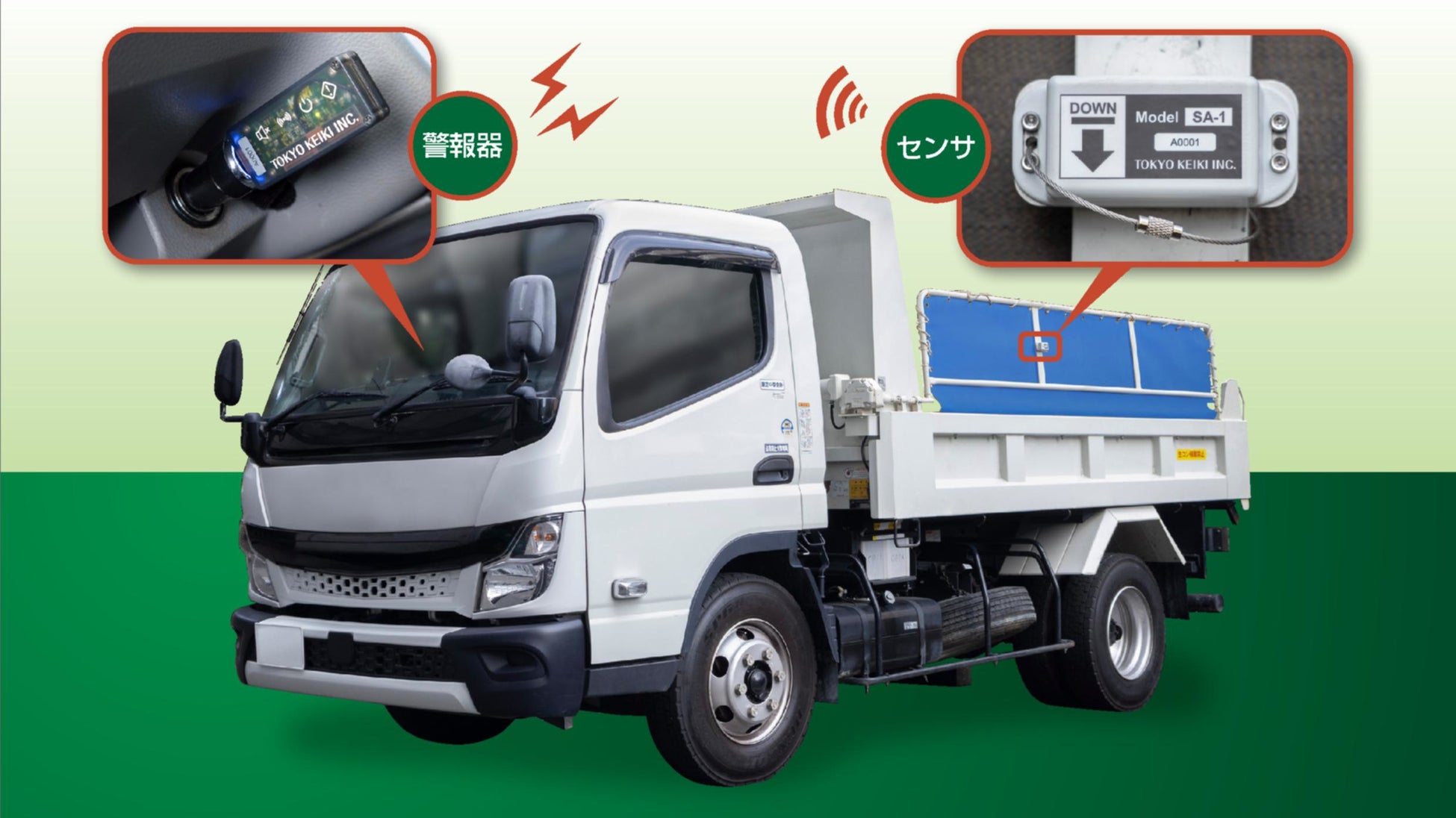 器SA-1」を2025年4月より販売開始したことをお知らせします。ダンプカーの飛散防止装置が開いた状態をセンサが検知すると、運転席にある警報器が音とLEDランプでドライバーに注意を促します。飛散防止装置が開いた状態での走行を予防することで、安全対策に貢献します。