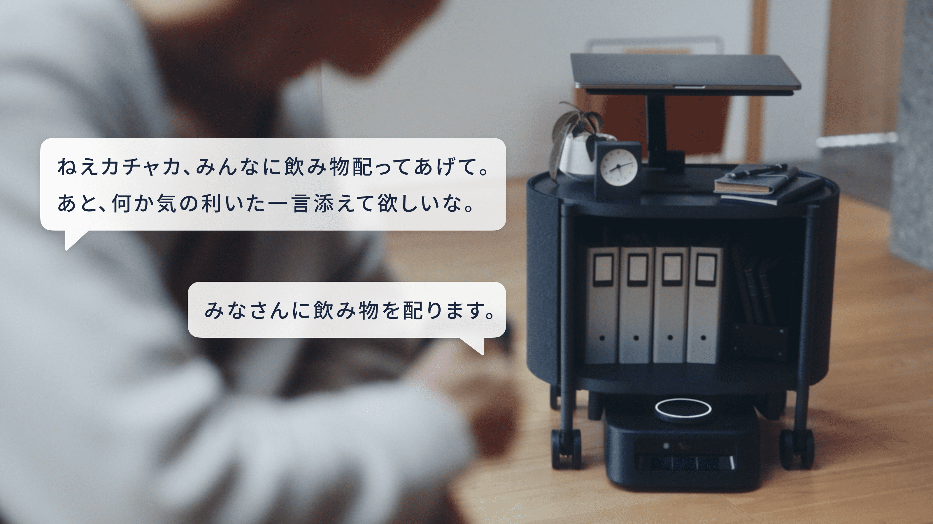 「皆さんの席を回って、一人ずつ褒めてください」といった指示で、カチャカが例えば一人ずつに「〇〇さん、いつもありがとう」「〇〇さん、とっても頑張ってますね」といった労いの言葉を、一人ひとりの名前と共に投げかけたりすることもできるようになります。更に、「疲れたなぁ」などの言葉をかけることで、お菓子の乗ったシェルフを運んできてくれ、その際、「元気に仕事しましょう」と臨機応変に励すことも可能になります。