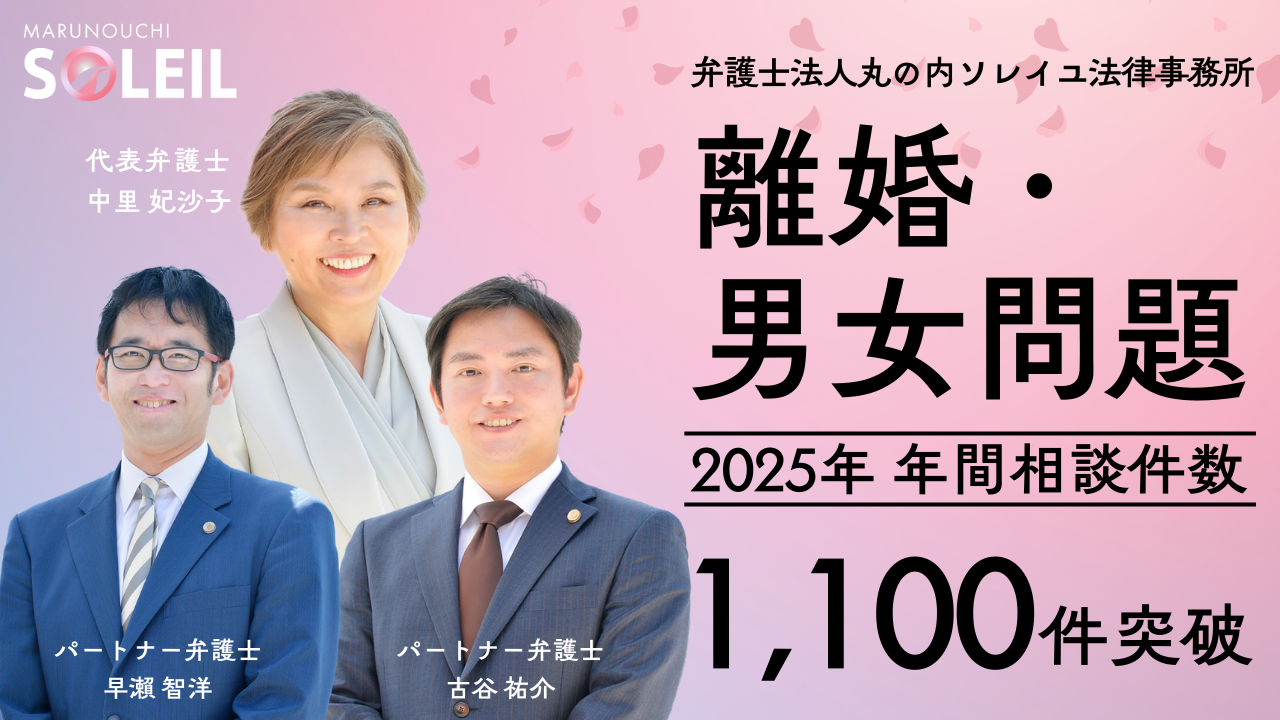 弁護士法人丸の内ソレイユ法律事務所(所在地:東京都千代田区、代表弁護士:中里妃沙子)は、2025年1月から12月までの1年間における離婚・男女問題分野の相談数が1,100件を突破したことをお知らせいたします。