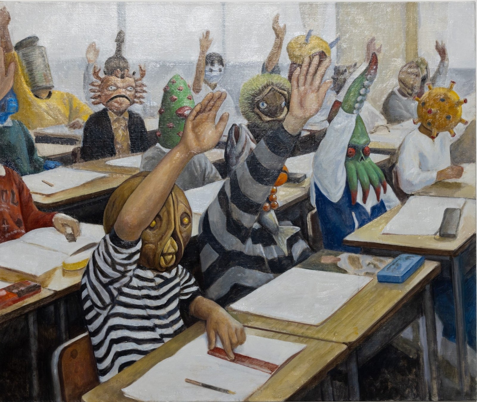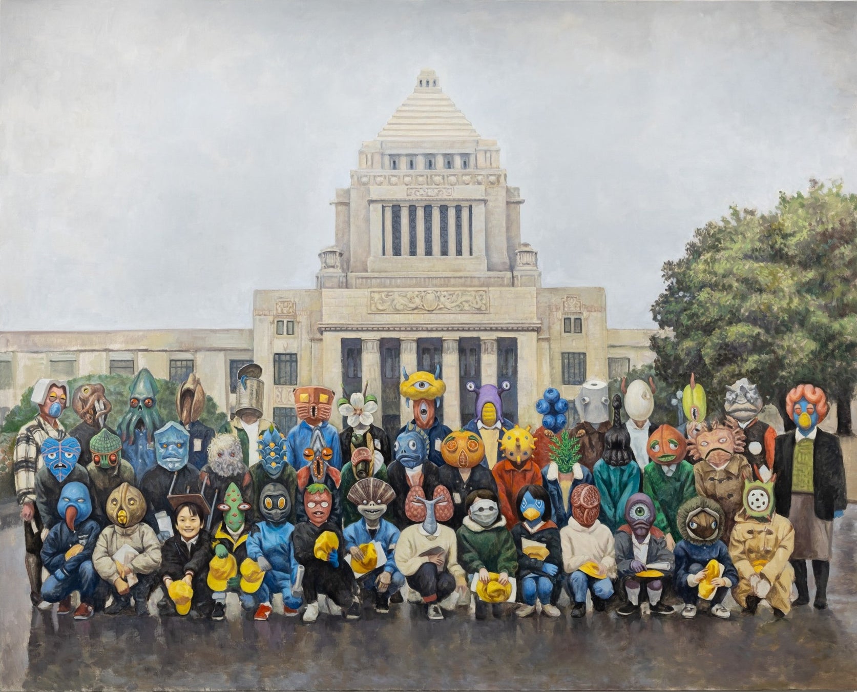 市川は、2011 年の東日本大震災を目の当たりにし、自分が特撮映画の世界の中に投げ出されたような感覚を覚えました。幼少期に見ていたテレビの中のヒーローと怪人達との対決、またそれらを取り巻く人間ドラマなど、大人になるにつれて切り離してきた世界が脳裏を過ります。しかし、現実にヒーローは存在せず、右往左往する人々の見え隠れするリアルな本能を前に、「人間」とは実は仮面をかぶったモンスターなのではないか、そんな疑念を持ち画面へと向かいます。「怪人」を時に自画像として、ある時は肖像画として描くことで自らの問いを表出しました。市川作品の中で怪人たちは、特撮映画における定番として人間を襲う存在ではなく、ごく当たり前の日常を生きています。彼らは可愛らしくもあり、親しみがありながら異様な、いわば日本が培ってきた「キャラ」文化の要素を含みつつも、そこに現代社会を生きる私たちの悲哀や孤独、人間の業といったものを感じさせます。