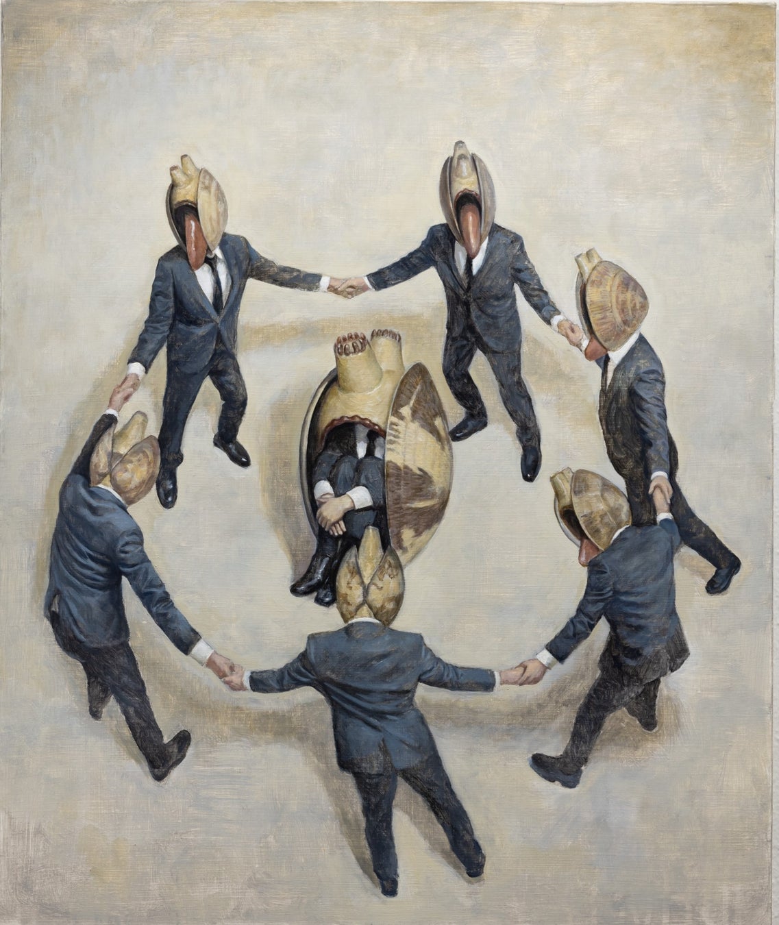 市川友章は、2011 年の東日本大震災を機に代名詞ともなる「怪人シリーズ」を描きました。体は人間ながら、頭はモンスターという異様でどこかに懐かしみのある「キャラクター」たちが、画面の中で私たち人間の日常を生きています。クラシカルな西洋絵画の画法で描き出される「怪人」たちは何を私たちに語りかけているのでしょうか。