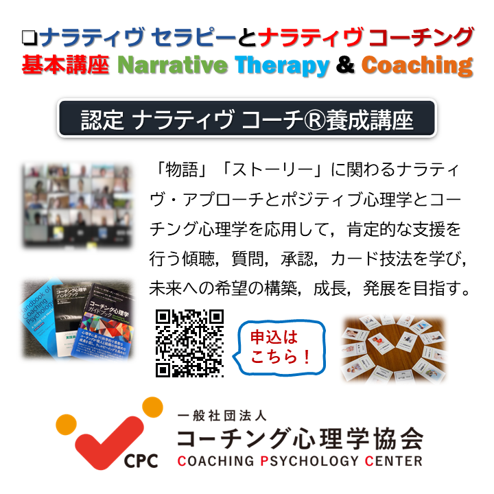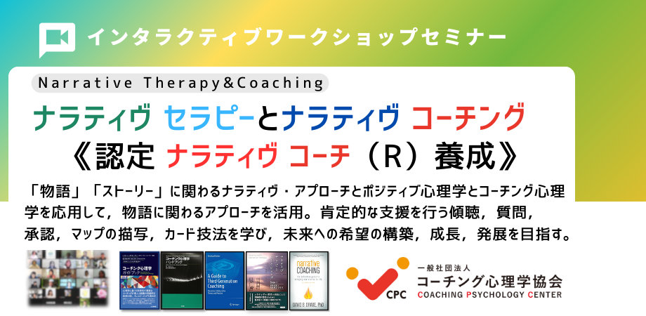 一般社団法人 コーチング心理学協会(本部:東京都港区)が主催し 2025年 5月31日-6月1日(日)2日間 9:00~ 17:30(2日間・両日),オンライン・ワークショップにて,【ナラティヴ・セラピーとナラティヴ・コーチング基本講座」を開催いたします。