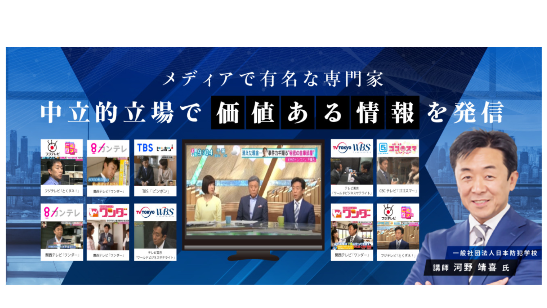 防犯カメラナビの代表は、日本防犯学校の講師としての実績を持ち、メディア出演や出版活動も行っています。