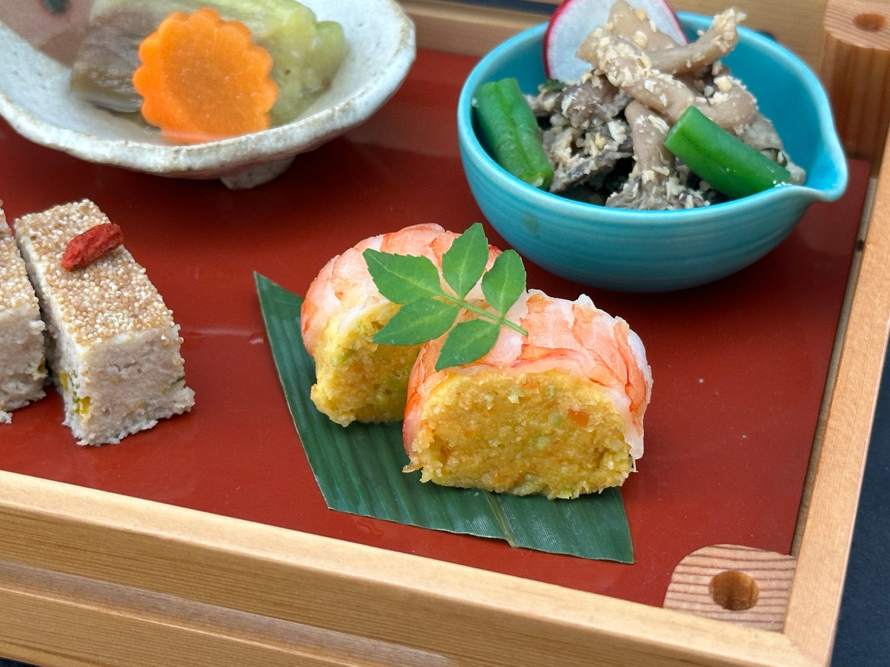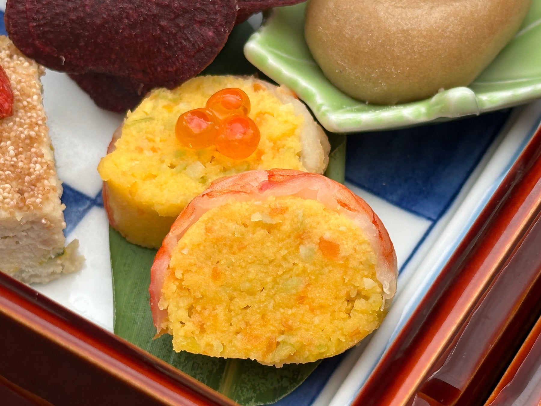 海老の赤、卵黄の黄色、枝豆の緑、人参のオレンジ色が美しく、料理に彩りを添えます。カットすると、枝豆と人参の断面が現れ、さらに華やかさを演出します。