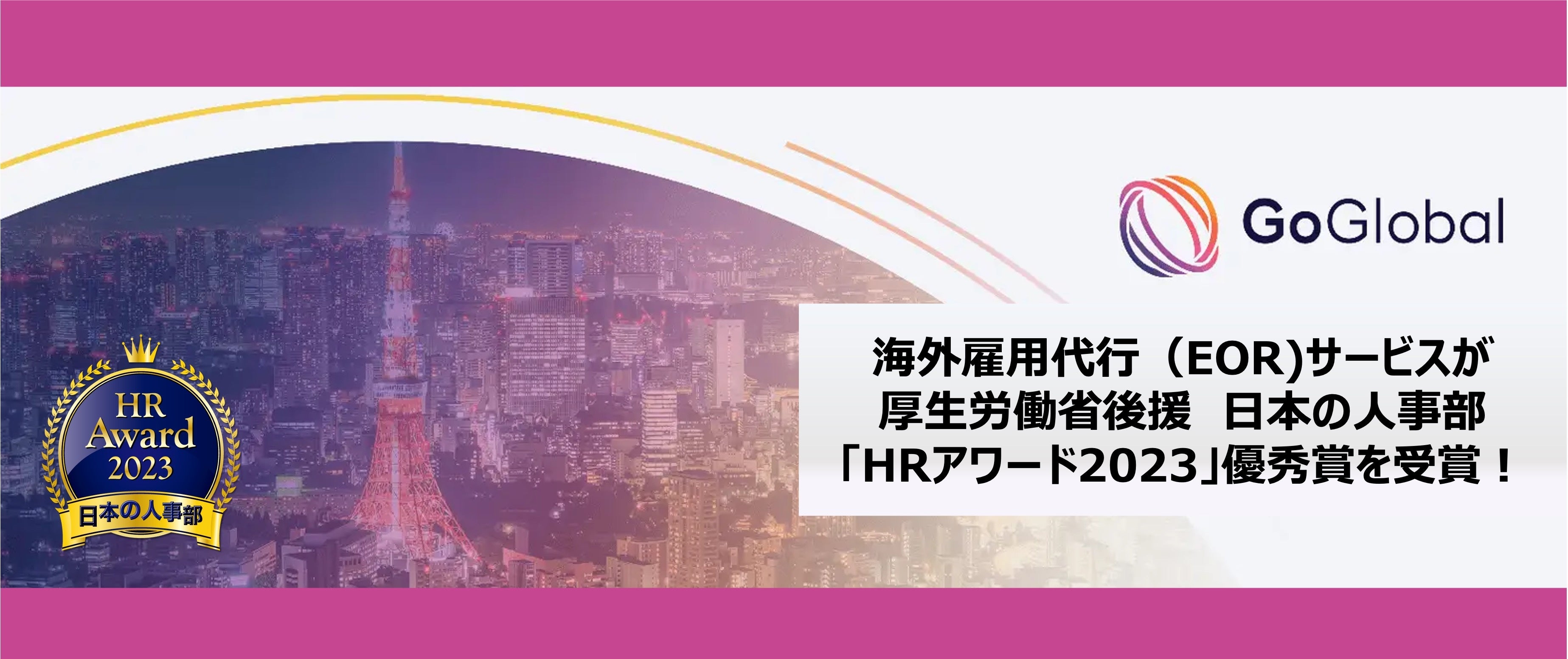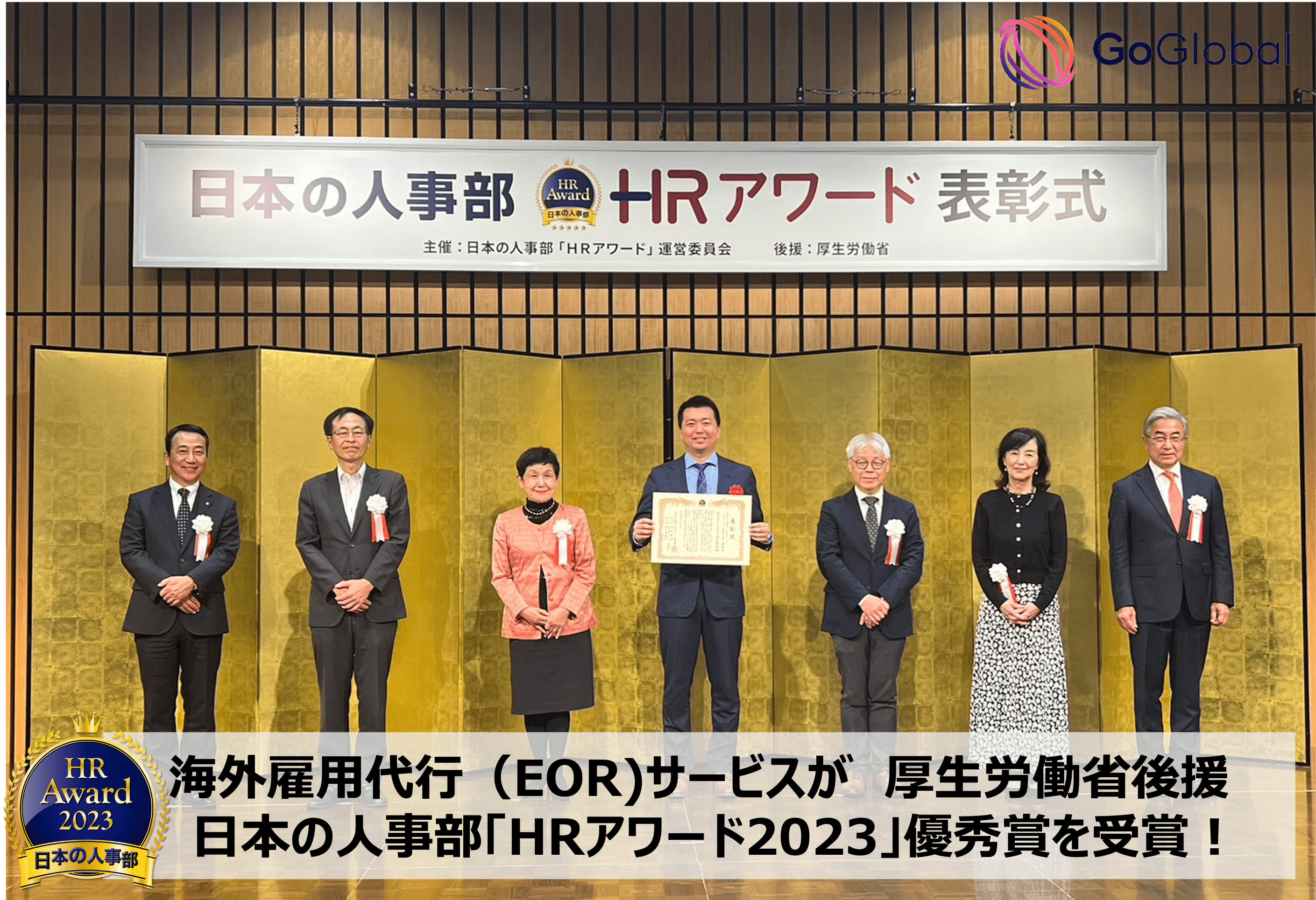 GoGlobal株式会社(港区、代表取締役;渡辺さち、沖室晃平、以下「GoGlobal」)が提供する「海外雇用代行(EOR)サービス」が、日本の人事部「HRアワード2023」(主催:「HRアワード」運営委員会、後援:厚生労働省)のプロフェッショナル人材採用・雇用部門にて優秀賞を受賞しましたことを発表いたします。