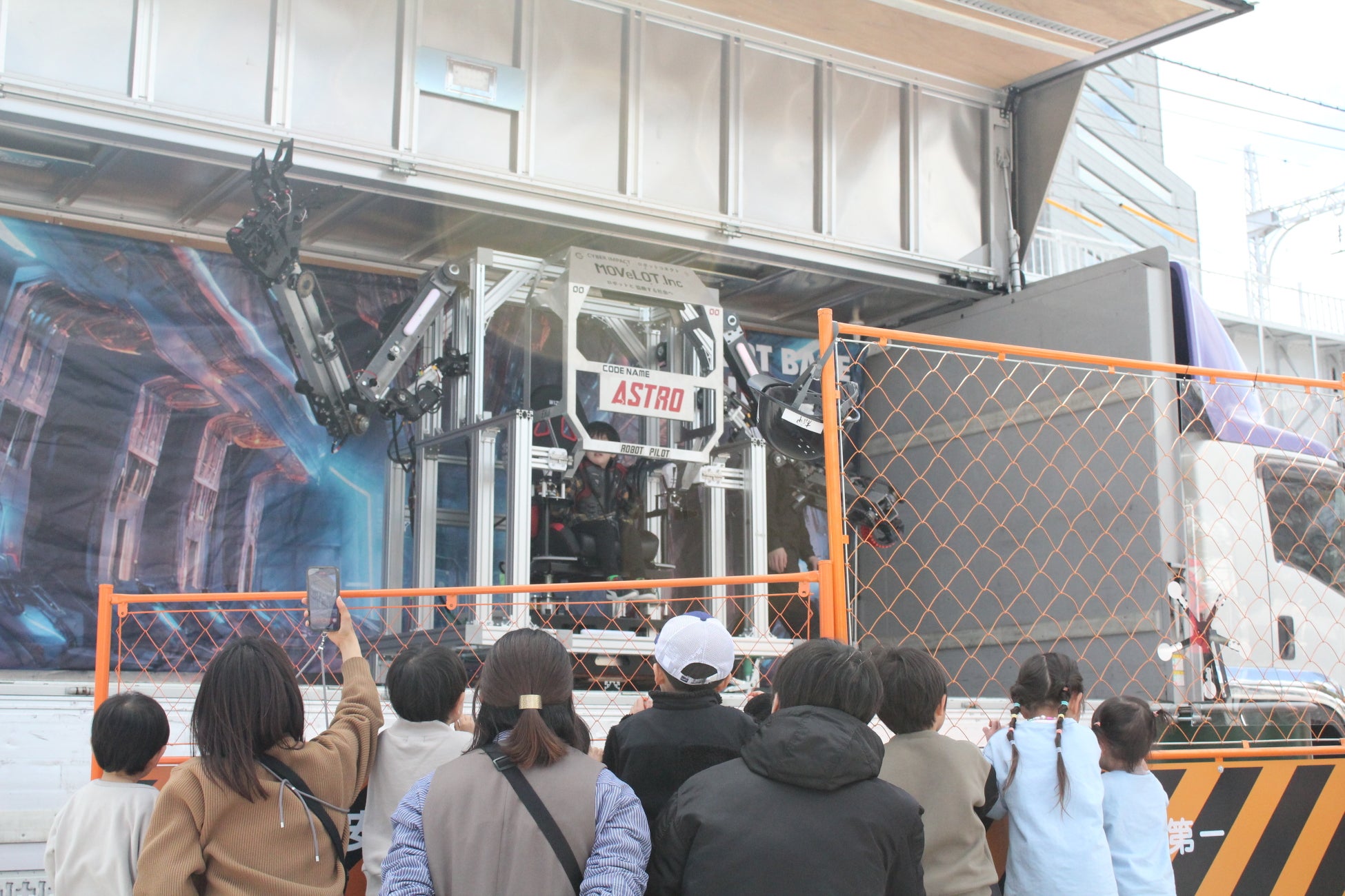ROBOT BASE UNITは、トラックなどに操縦空間を格納して様々な場所に移動し、最短 ”20分” で設置と体験提供が可能。駐車場や公園など空きスペースがあればどこでも設置可能な空間移動式コンテンツ。