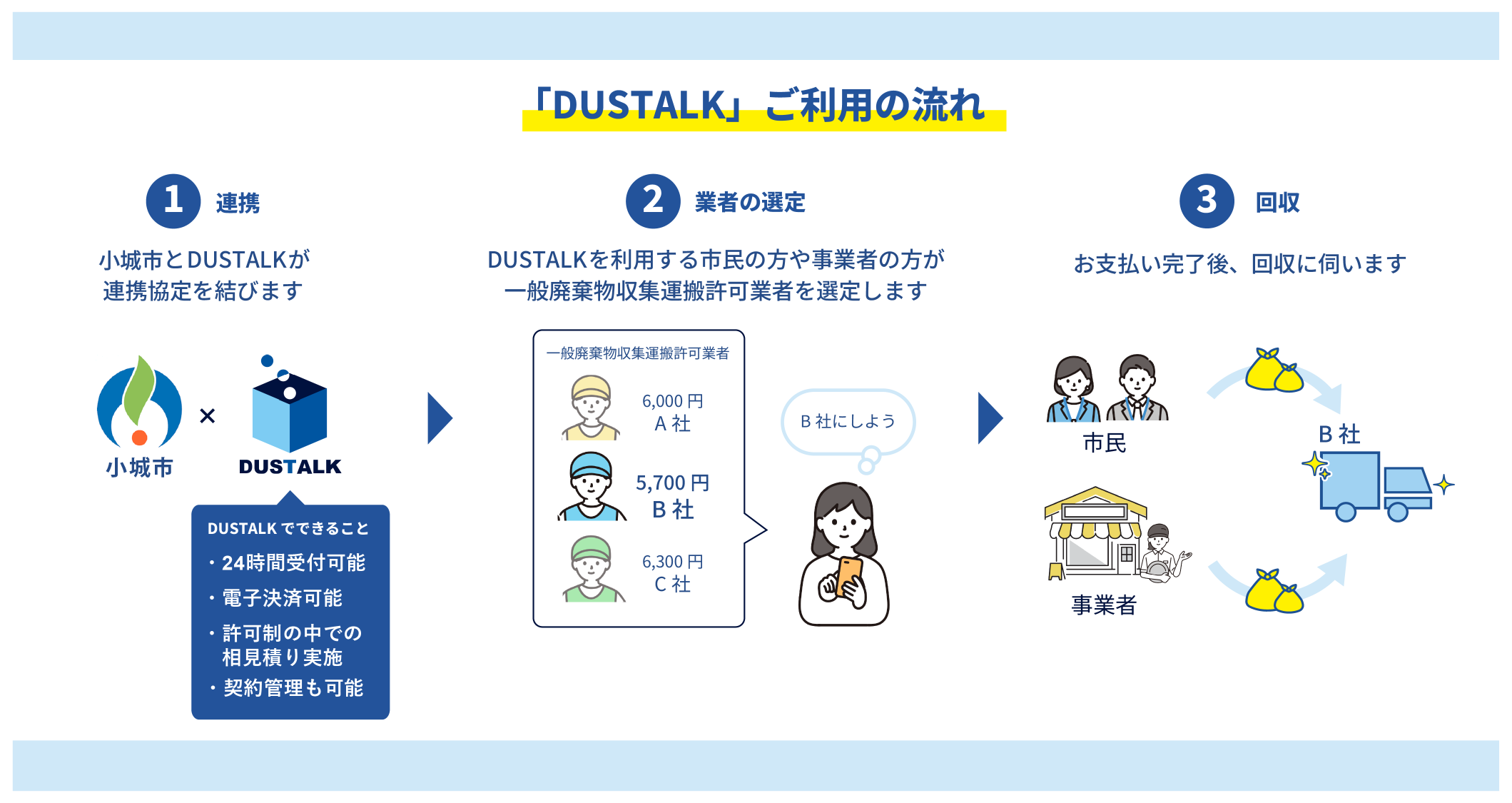 小城市では、一般廃棄物の適正な処理を促進し、市民および事業者の利便性向上を目指しています。一方で、許可を持たない業者による不適切な処理や不法投棄が発生するリスクや、収集手続きのスマート化に向けた課題がありました。こうした課題を解決するため、当社グループ会社(株式会社ビートルマネージメント)が提供する「ダストーク」と連携し、許可業者と排出者を適切につなぐことで、スマートフォンアプリを通じたスムーズな廃棄物収集を実現し、市民や事業者の負担軽減を図ります。