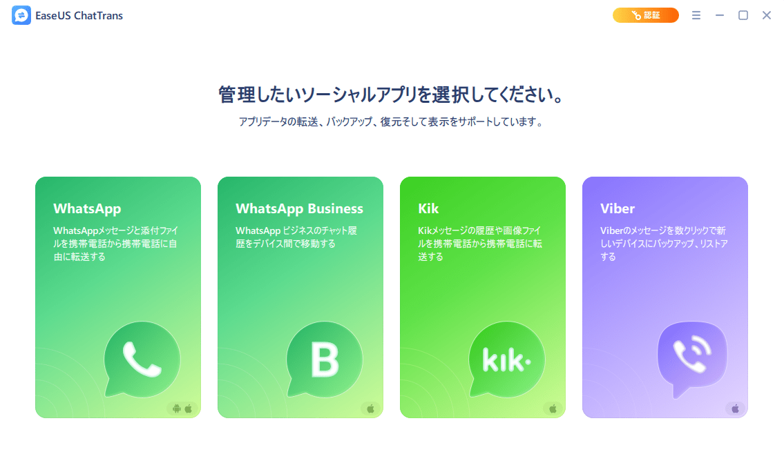EaseUS ChatTransは携帯ソーシャルチャットアプリの移行ソフトで、主の機能は以下のリストのとおり: