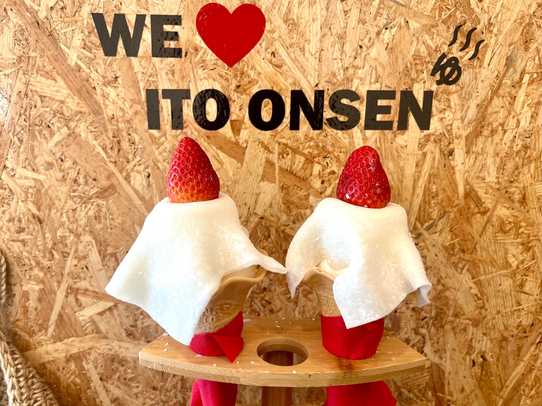伊東市の玄関口「伊東駅」周辺を美味しいものを片手に散策できる新商品「丸ごといちご大福ソフト」を同時販売。ミルクソフトにもちもちの求肥はまるで大福もち。
