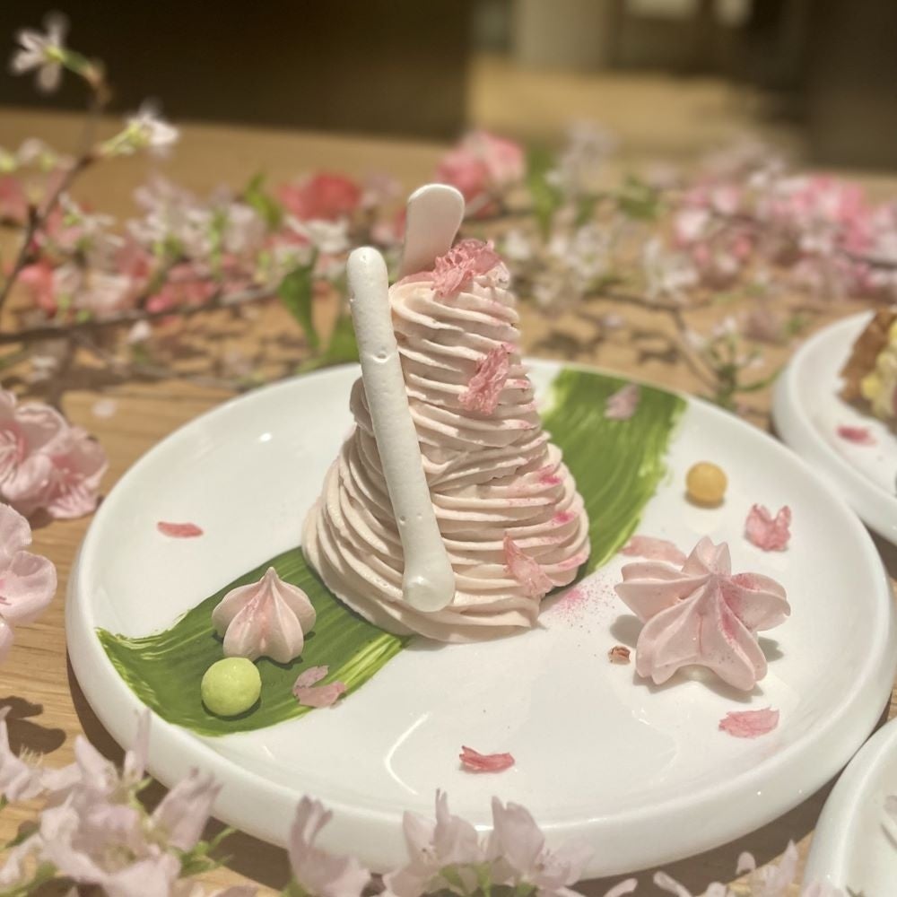 さくらモンブラン :センターには丸々一粒の苺を贅沢に使用し、抹茶のチョコクリームと桜餡が入っています。周囲には桜のクリームをたっぷり絞り、華やかさを添えています。お皿の上には桜の形をしたメレンゲやおいりを配置し、桜の花びらを散らして、春らしい雰囲気に仕上げています。