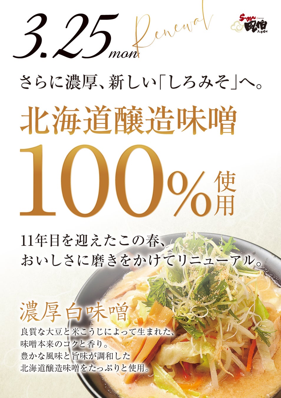 株式会社キタカタ(本社:新潟県新潟市)が運営するらーめん店「風伯(ふうはく)」は、創業11年目を迎えるこの春に、一番人気の「しろみそ野菜」らーめんのリニューアルを決定。北海道で醸造した味噌を100%使用し、2種類の異なる個性の白味噌を独自の配分でブレンドすることで、より旨味が凝縮されたコク深い濃厚スープに進化しました。2024年3月25日(月)より販売開始いたします。