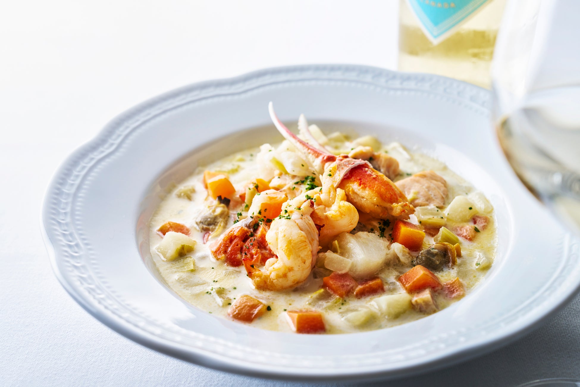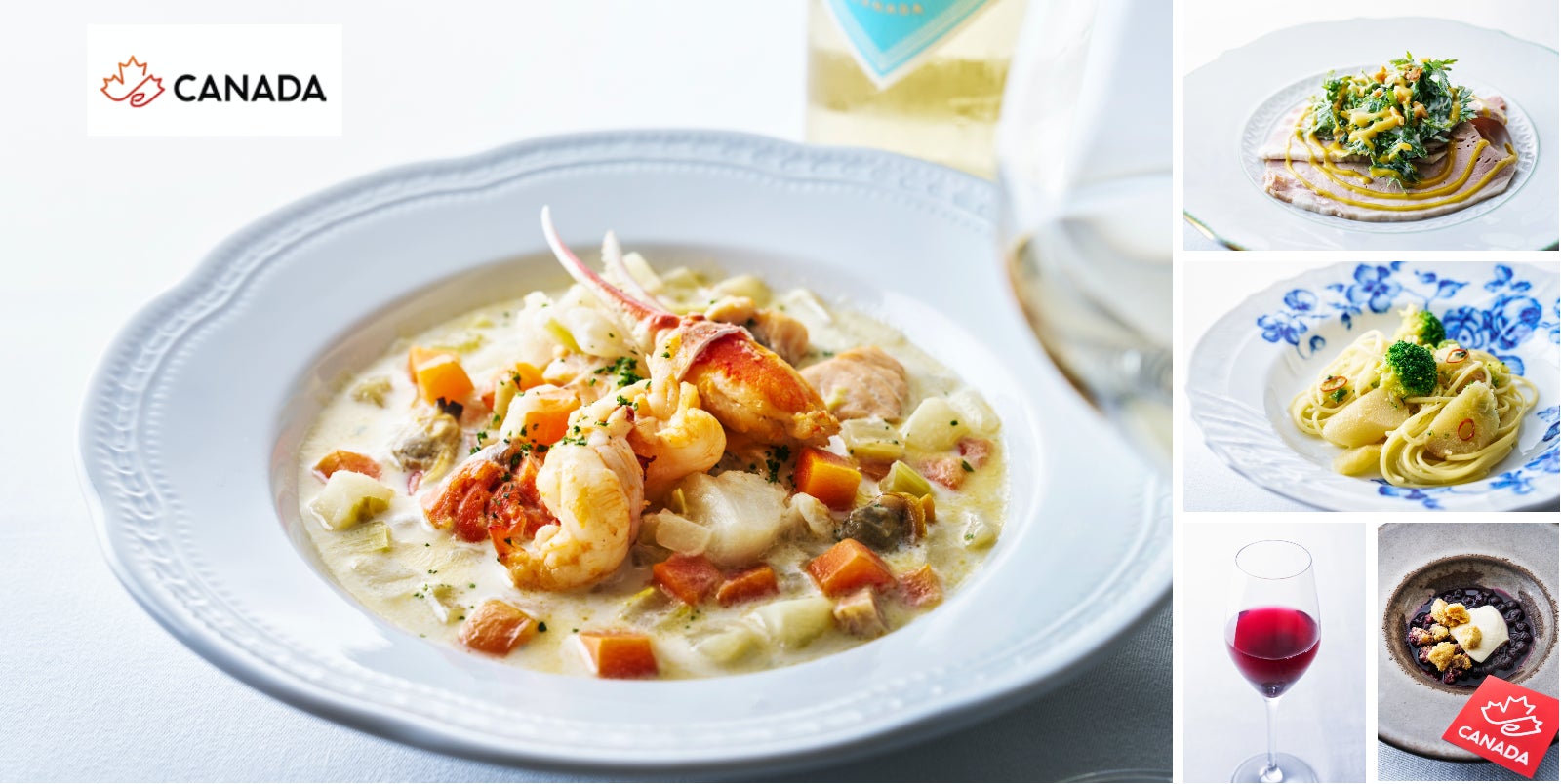 春から夏にかけて旬を迎えるカナダ産のシーフード、ロブスター、ズワイガニ、カラスガレイ、サーモン等を贅沢に使った「カナダチャウダー」はカナダが誇る名物料理です。