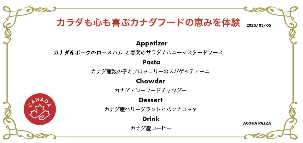 カナダ産の食材11品目を使ったクッキングデモとヘルシーなコース料理が楽しめる、カラダも心も喜ぶカナダフードの恵み体験イベントを3月5日(水)に人気レストラン「アクアパッツァ」で開催しました!