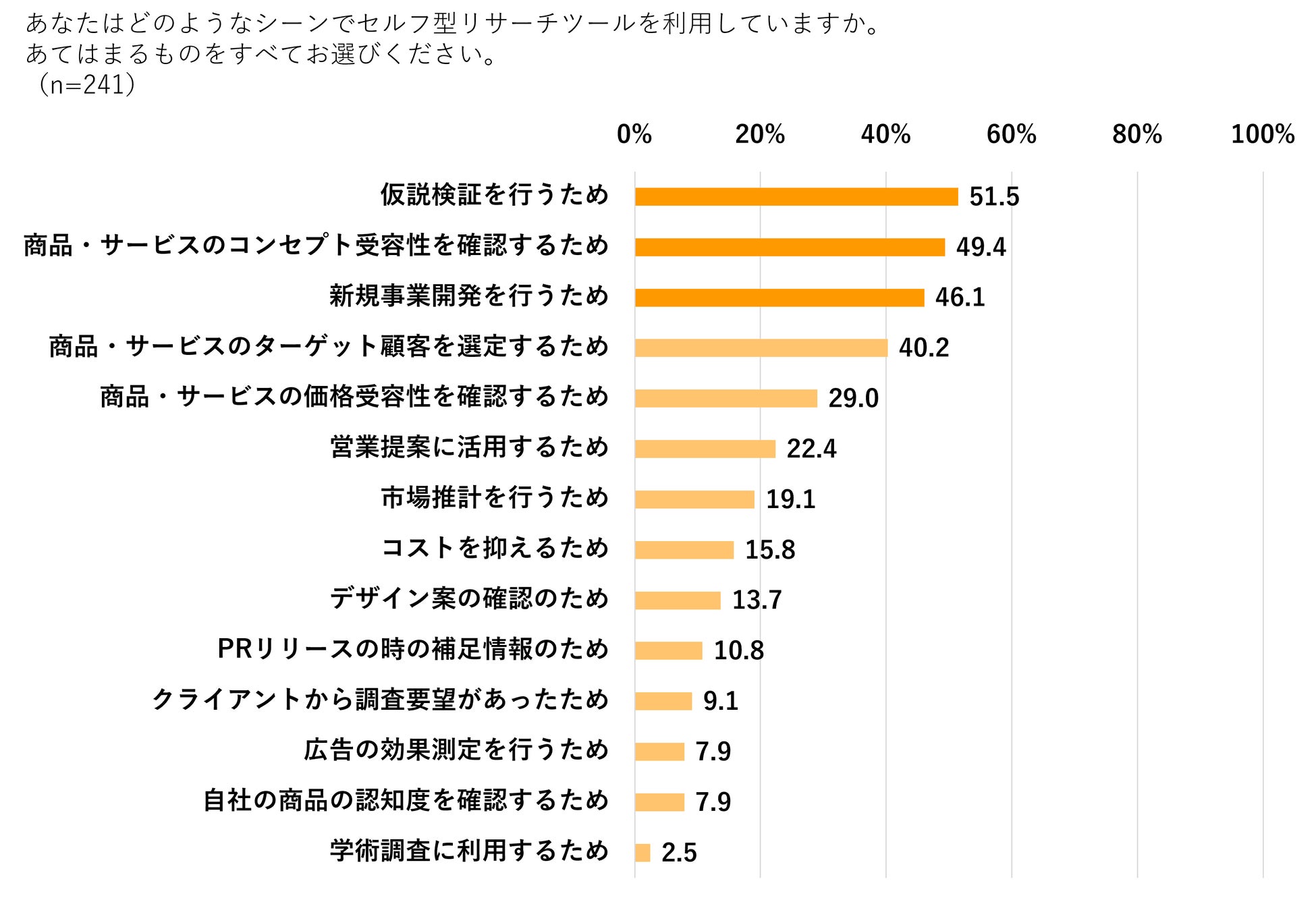 利用シーン別に結果を見ると「仮説検証を行うため」(51.5%)、「商品・サービスのコンセプト受容性を確認するため」(49.4%)、「新規事業開発を行うため」(46.1%)、「商品・サービスのターゲット顧客を選定するため」(40.2%)、が多く挙げられ、新規事業や新商品開発における仮説検証や受容性の把握を目的として利用されていることが分かります。