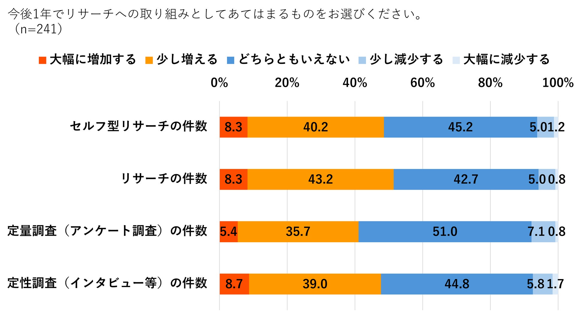 今後のリサーチ件数の傾向については51.5%のユーザーが増加、セルフリサーチサービスの活用については、48.5%のユーザーが増加していく傾向にあると回答しています。