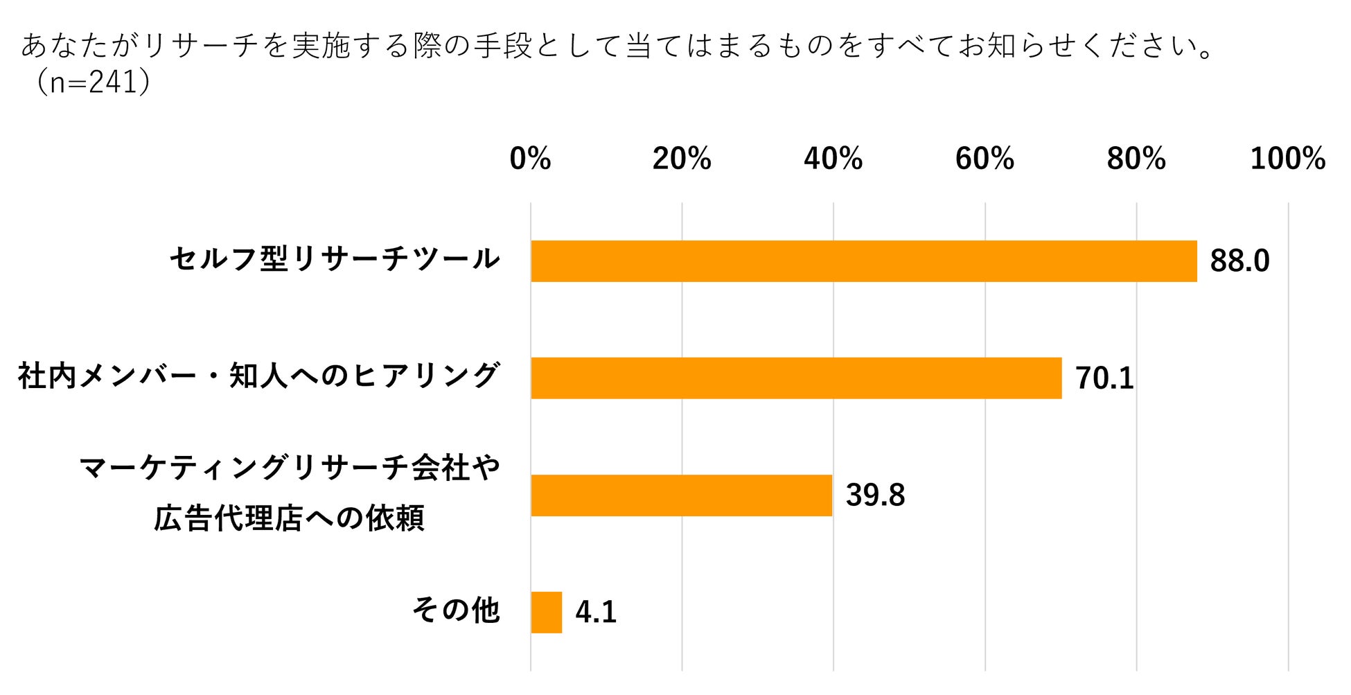 「マーケティングリサーチ会社や広告代理店への依頼」をリサーチを実施する手段として回答した割合は約40%となりました。