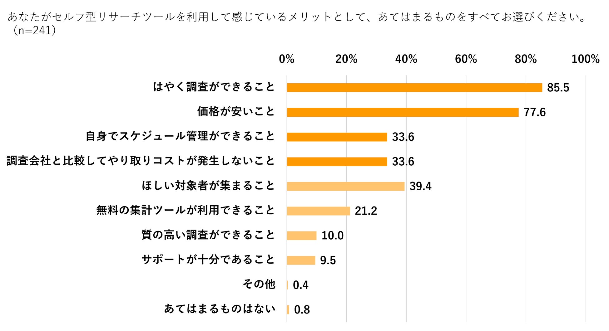 セルフリサーチサービスの一番のメリットは「速さ」と「安さ」。セルフリサーチならではの「手軽さ」と「柔軟性」も大きな魅力となっている。