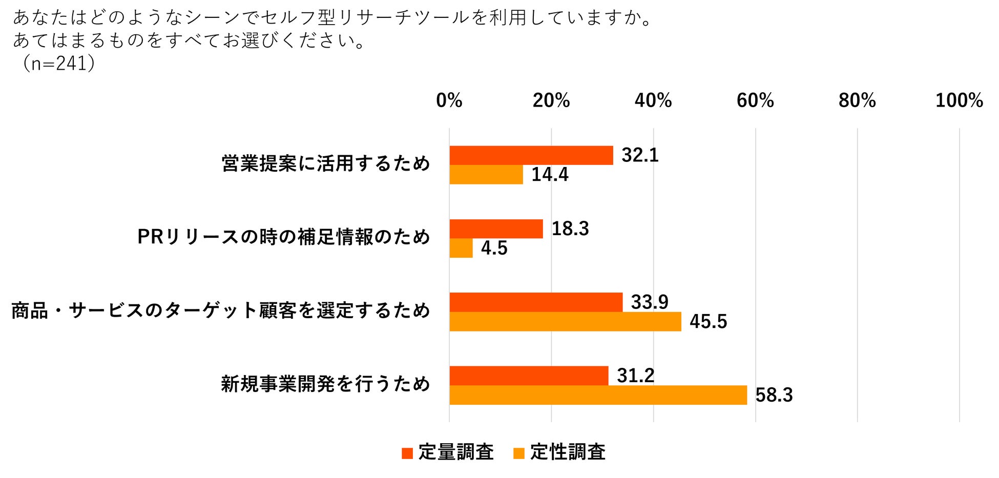 定量型では定性型と比べて、「営業提案に活用するため」(32.1%)、「PRリリースの時の補足情報のため」(18.3%)等の、量的なデータで根拠を示したい場面での活用が目立ちます。