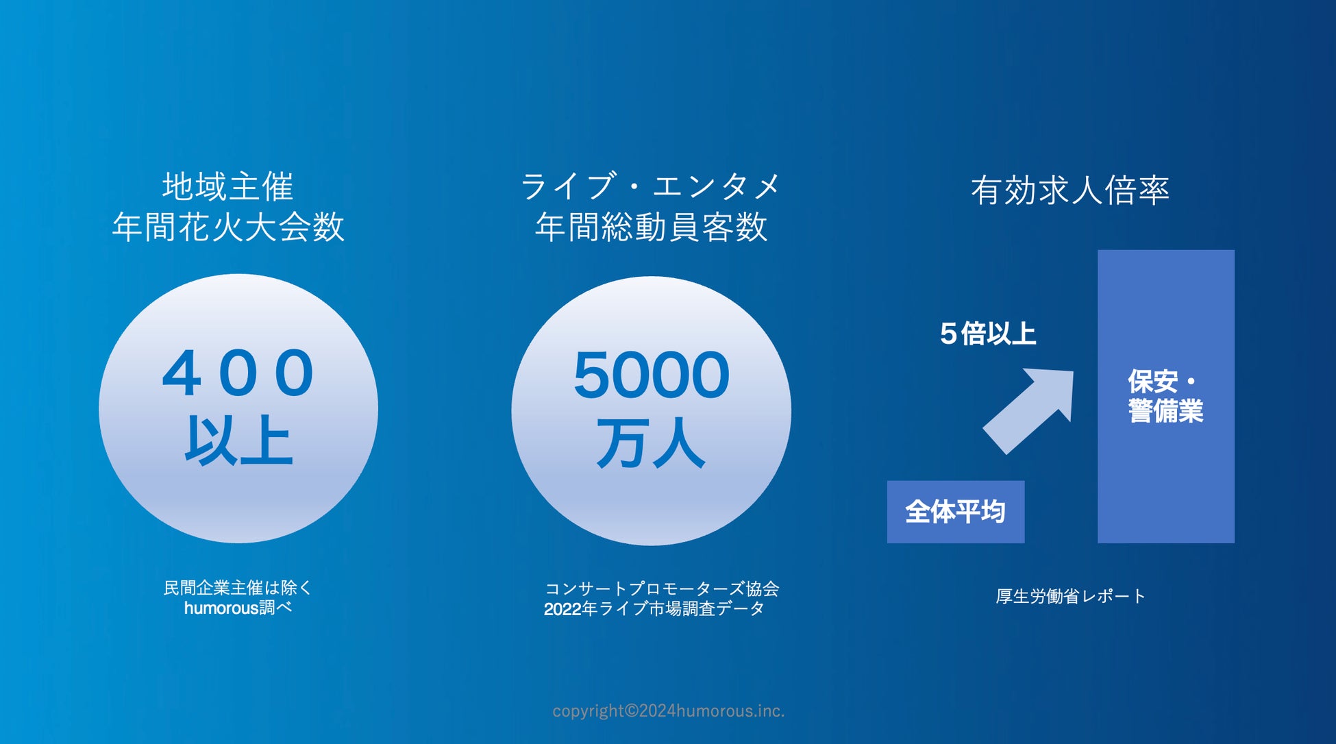 また、国内で開催されるイベントの数は増加傾向であり、年間約400もの花火大会が開催され(民間事業者開催を除く)、音楽フェスやライブの動員数は年間5000万人規模に達し、また全国各地の祭りなどに伴う来場者数はコロナ禍の経済回復やコト消費の風潮もあり、増加の一途を辿っています。