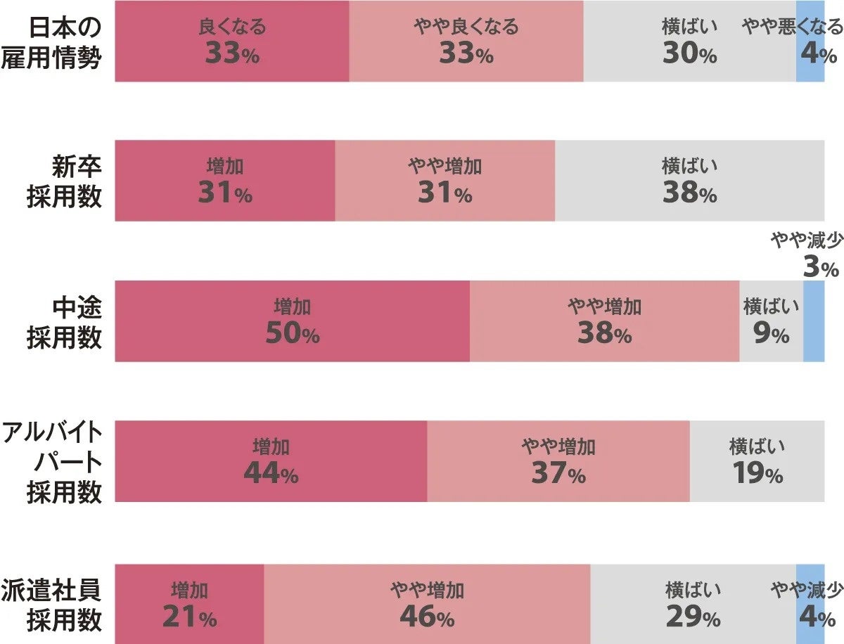 2025年の日本の雇用情勢は「良くなる・やや良くなる」との回答が66%となった。企業の人材採用数は、新卒、中途、アルバイト・パート、派遣のいずれも「増加・やや増加」が大きな割合を占めている。
