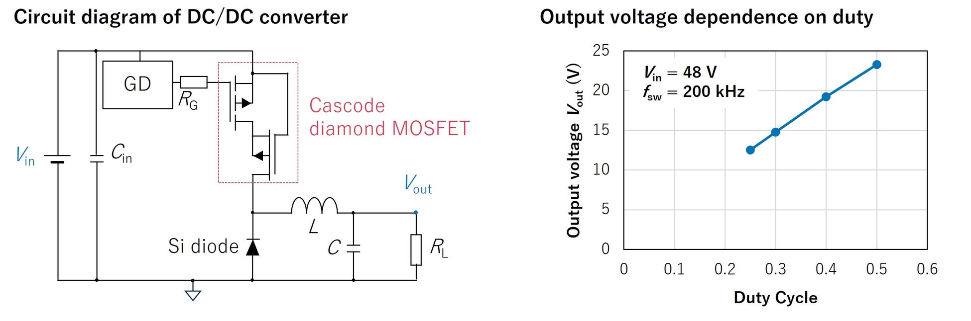 The results confirmed that the output voltage of the developed DC/DC converter varied in accordance with the duty cycle, successfully demonstrating— for the first time in the world—power conversion operation using a diamond MOSFET. In addition, stable converter operation clearly showed that diamond MOSFETs can support continuous switching operation, a key requirement for practical power electronics applications.