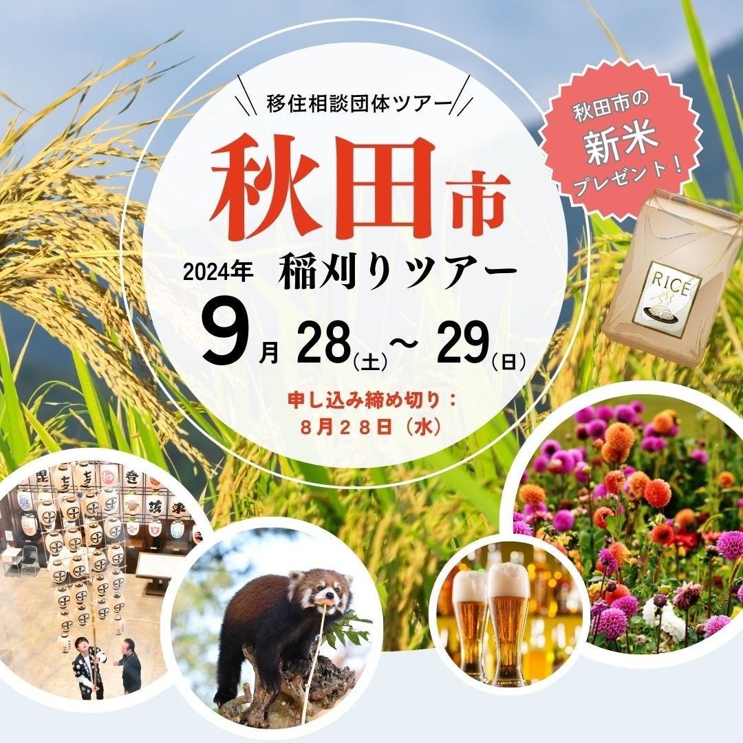 秋田市では、これから移住を検討している県外在住の方を対象として、稲刈り体験や先輩移住者・農家の皆さんとの交流を通して、秋田市の暮らしや魅力を体験していただくツアーを開催します。