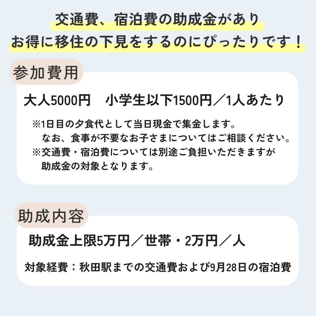 本ツアーは「秋田市移住相談ツアー助成金」の対象です。交通費、宿泊費については別途ご負担いただきますが、助成金の対象となります。