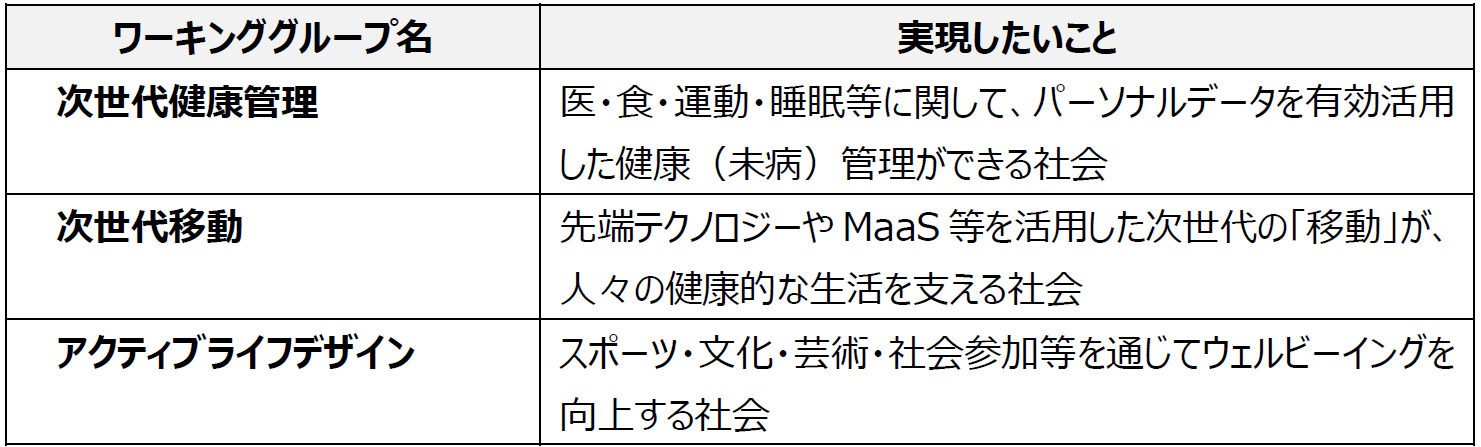 また、アイパークインスティチュート、湘南鎌倉総合病院、神奈川県、藤沢市、鎌倉市の5者が連携(2019年5月15日付「村岡・深沢地区のヘルスイノベーション最先端拠点形成等に係る連携・協力に関する覚書」による取組み、通称「5者連携」)して、未病改善や最先端医療の実用化を目的として実証研究を行ってきましたが、本コンソーシアムはこの取り組みを引継ぎ、さらに加速させるためのものです。これに伴い、本コンソーシアムの中に3つのワーキンググループ(次世代健康管理、次世代移動、アクティブライフデザイン)を発足いたします。