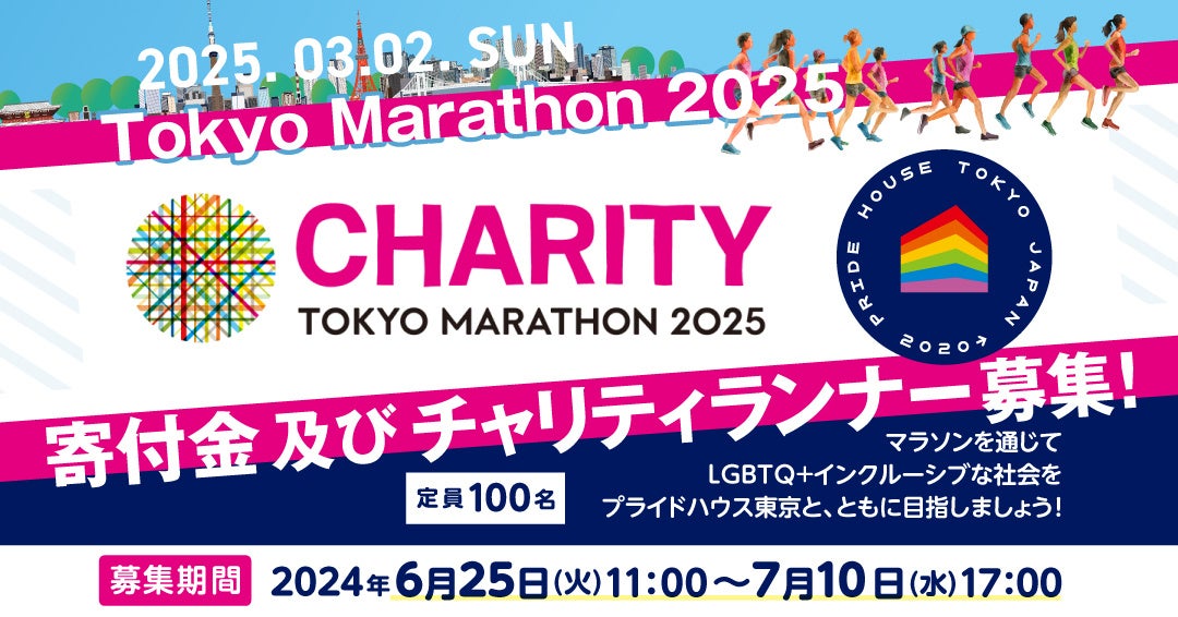 NPO法人プライドハウス東京(以下、プライドハウス東京)は、東京マラソン財団チャリティRUN with HEART(※1)の寄付先団体として、2025年3月2日(日)に開催される「東京マラソン2025」の寄付金及びチャリティランナーを100名募集します。