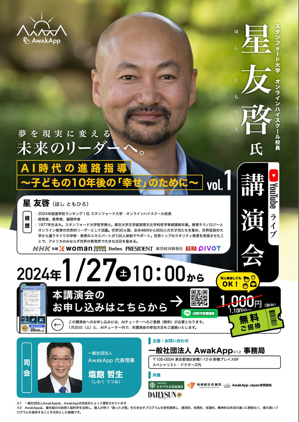 第一回目の講演会では、スタンフォードオンラインハイスクール校長である星友啓先生が登壇されます。(資料のダウンロードはこちらから)