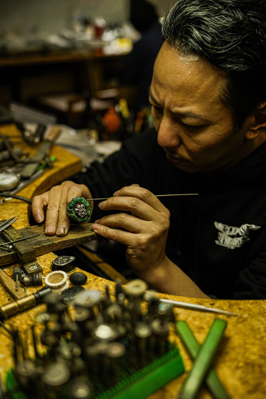 中央に組み合わせるシルバーパーツのデザインを20種類ものバリエーションから選択してのカスタムや、スティングレイレザーのカラーや種類を変更してのオーダーも可能となる特別なリング。