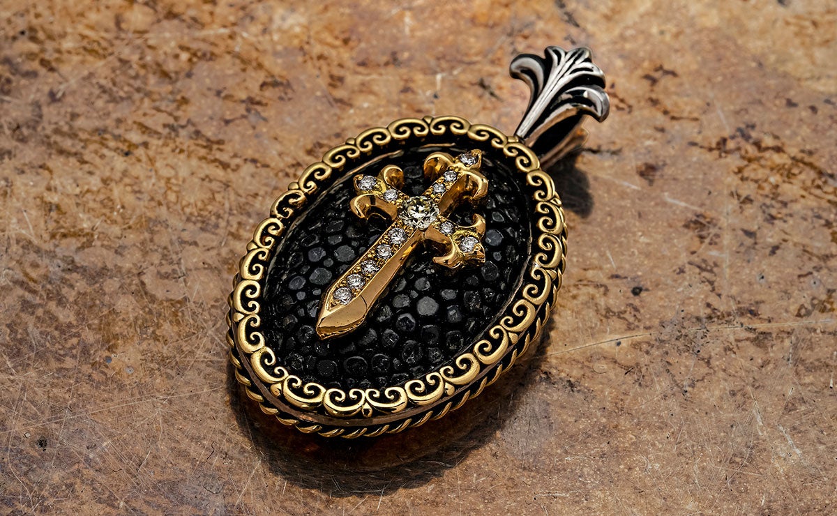 レザーズアンドトレジャーズの作風でもある古き良きアンティークジュエリーの雰囲気を取り入れ、中央と両側面にスティングレイレザー(エイ革)を埋め込むインレイ技法を採用し、2代目デザイナーである向條氏の作品としては、最も大きなデザインとなる。