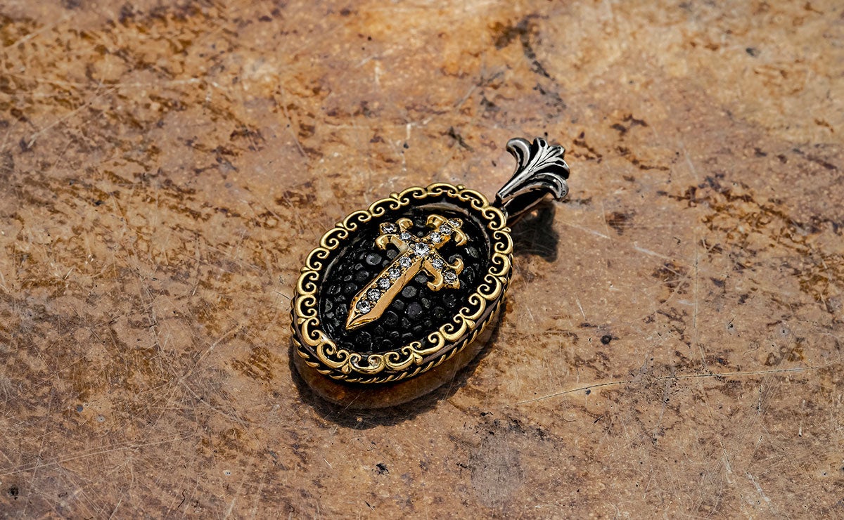 シンプルにインレイ技法のデザインが際立つよう、アンティークのブローチを想わせるシルエットで表現したペンダントも2サイズでリリース。