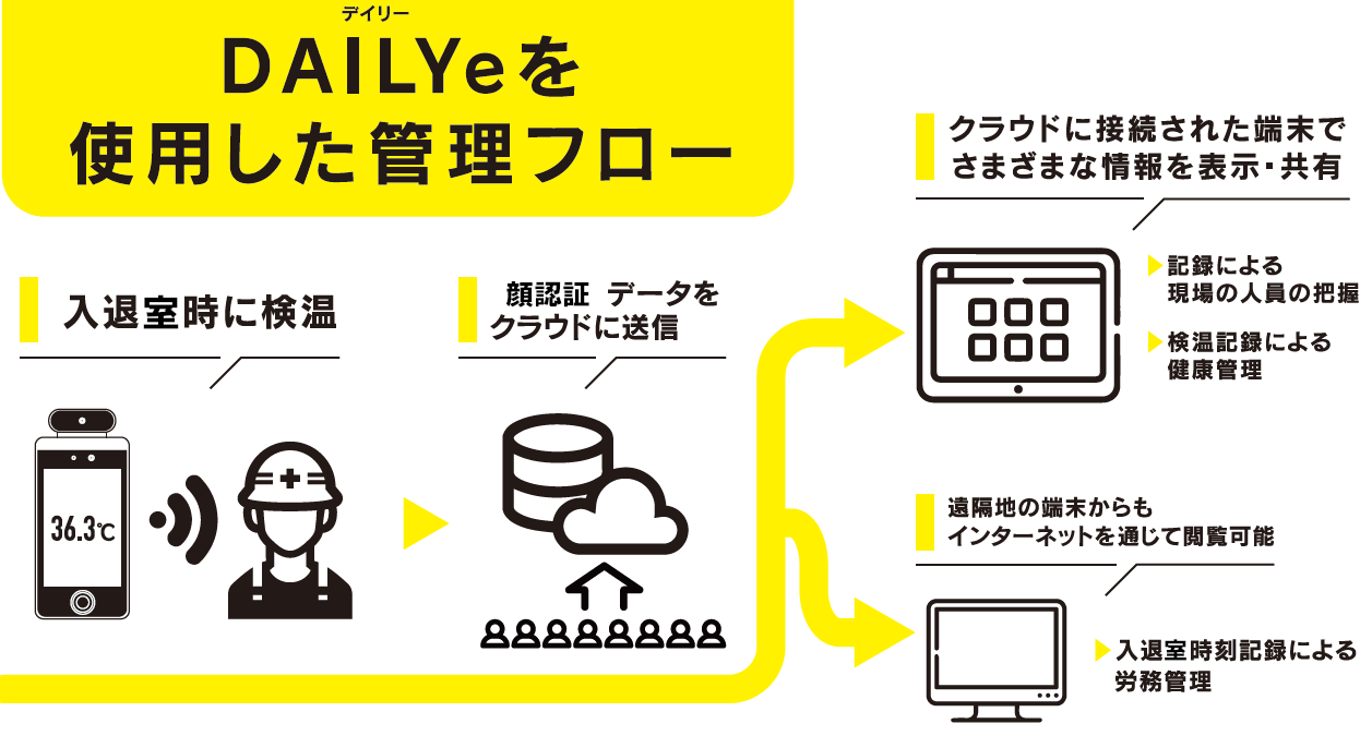 「DAILYe(デイリー)」は、クラウド上でAIによる顔写真の自動照合を行い、同データを含めた入退場管理情報をクラウド上で自動整理するシステムです