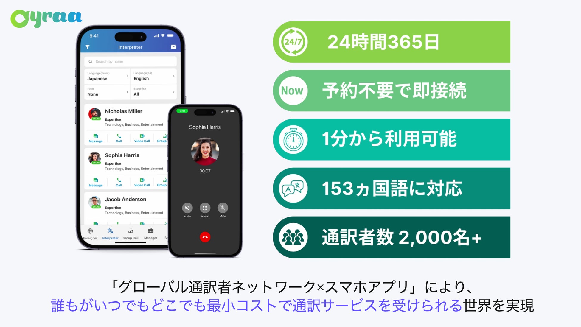 Oyraaは、24時間365日いつでも予約不要でプロの通訳者を呼び出し1分単位で言語支援を受けられる通訳アプリです。独自のグローバルプラットフォームに153言語2,000名の通訳者が登録しており、その中から最適な通訳者を選んで即時に呼び出すことができます。スマホアプリのため場所を選ばず利用でき、旅行・出張先でのコミュニケーションや、役所・病院での手続き、各種電話問い合わせといった日常のあらゆるシーンに最適です。通訳利用料は使った分だけ、平均120円/分でご利用いただけます。IP電話のため国内外どこに電話しても通話料は無料です。