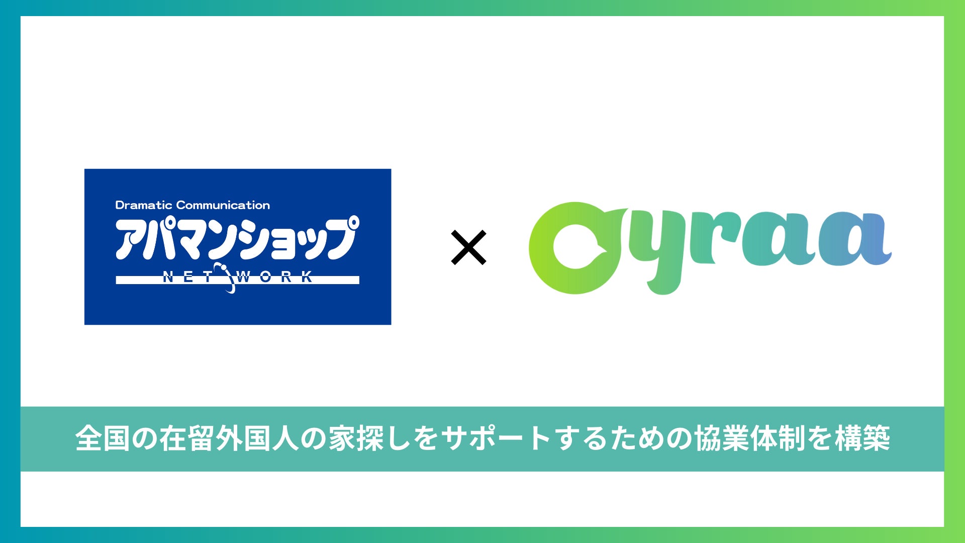 「あらゆる言語の壁を取り払い、誰もが好きな場所で生きられる多文化共生社会を実現する」ことをmissionに掲げる株式会社Oyraa(代表取締役社長:コチュ・オヤ、本社:東京都新宿区、以下:当社)は、日本一の賃貸斡旋店舗数を誇る「アパマンショップ」のフランチャイズ本部であるApaman Network 株式会社とともに全国の在留外国人の家探しをサポートするための協業体制を構築したことをお知らせいたします。