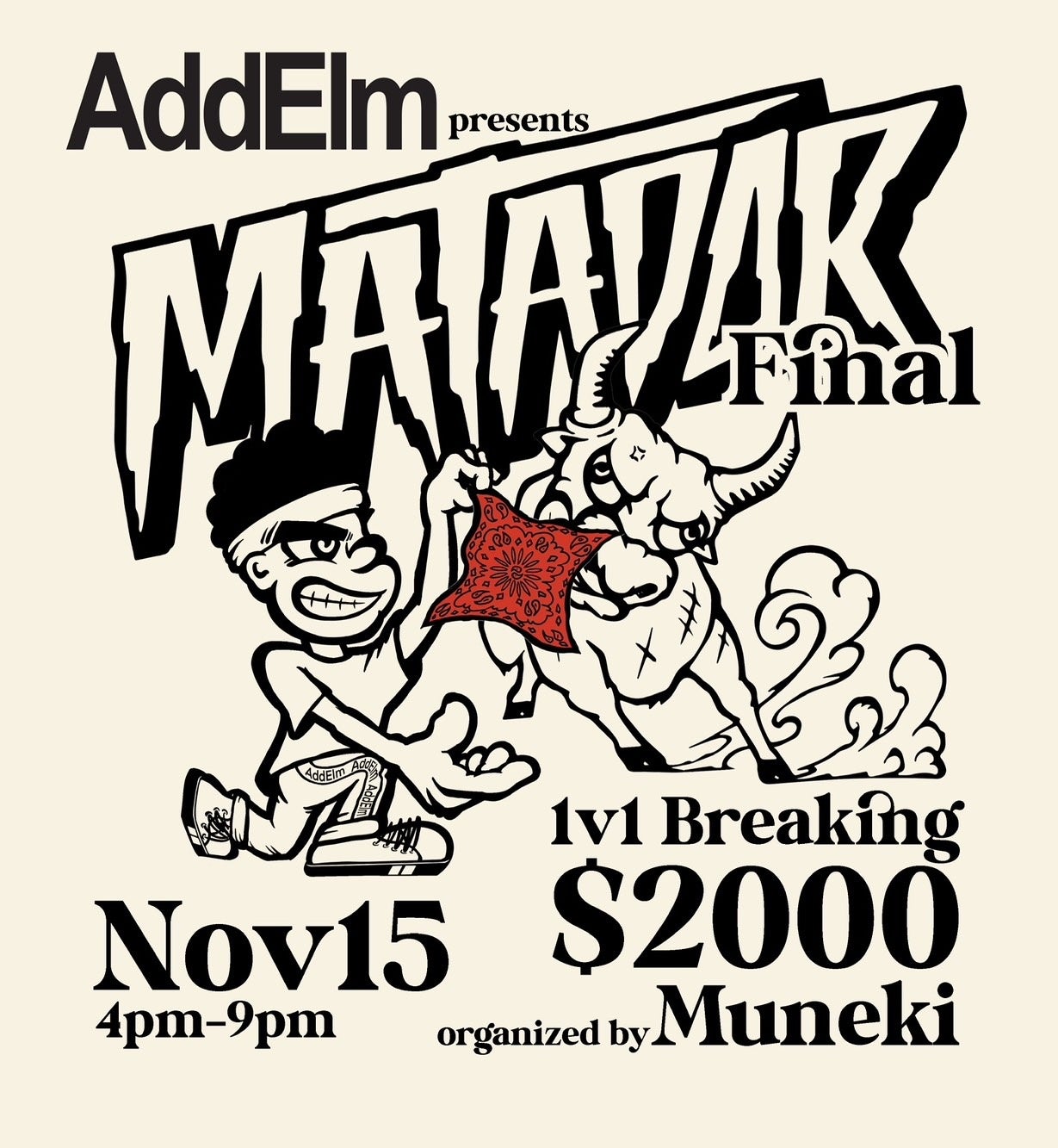 AddElm TECHNOLOGY社が冠スポンサーとなり、企画・運営するブレイキンバトルイベント。複数人が輪になって即興でブレイクダンスを披露する「サイファー」 形式にて行われる。