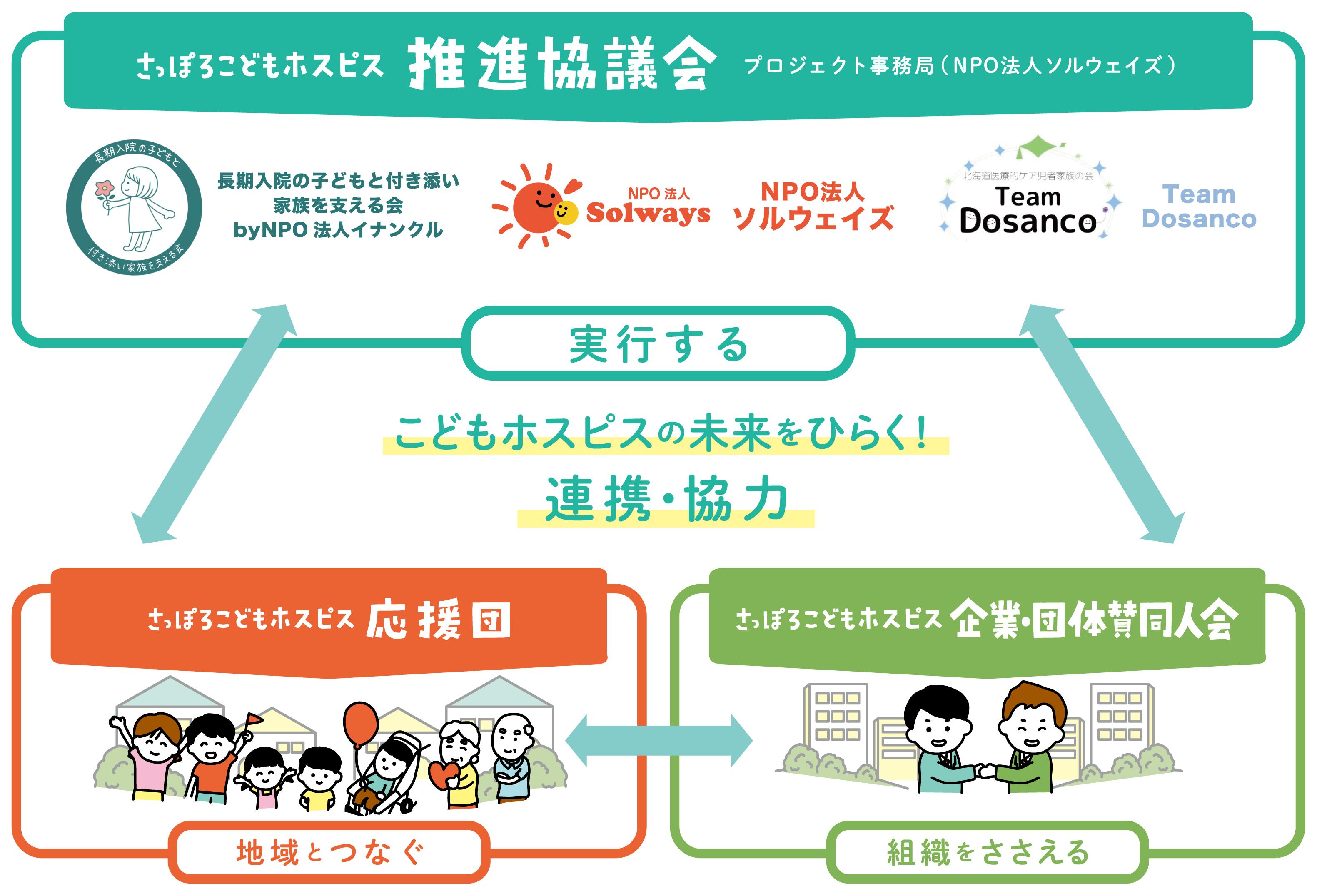 小児がんや難病、重い障がいや医療的ケアのある子ども及びその家族が安心して過ごせる地域社会の実現を目指し、札幌地域におけるこどもホスピスの必要性の検討、設立準備及び持続可能な運営体制の構築を推進することを目的(会則・第3条目的)とし、北海道札幌市を拠点に活動する「NPO法人ソルウェイズ」「長期入院の子どもと付き添い家族を支える会byNPO法人イナンクル」「北海道医療的ケア児者家族の会 Team Dosanco」が実行団体として組織する協議会です。札幌市内に拠点(2028年OPEN)を目指して、人材を育成し、当事者・ご家族の声とともに進めてまいります。